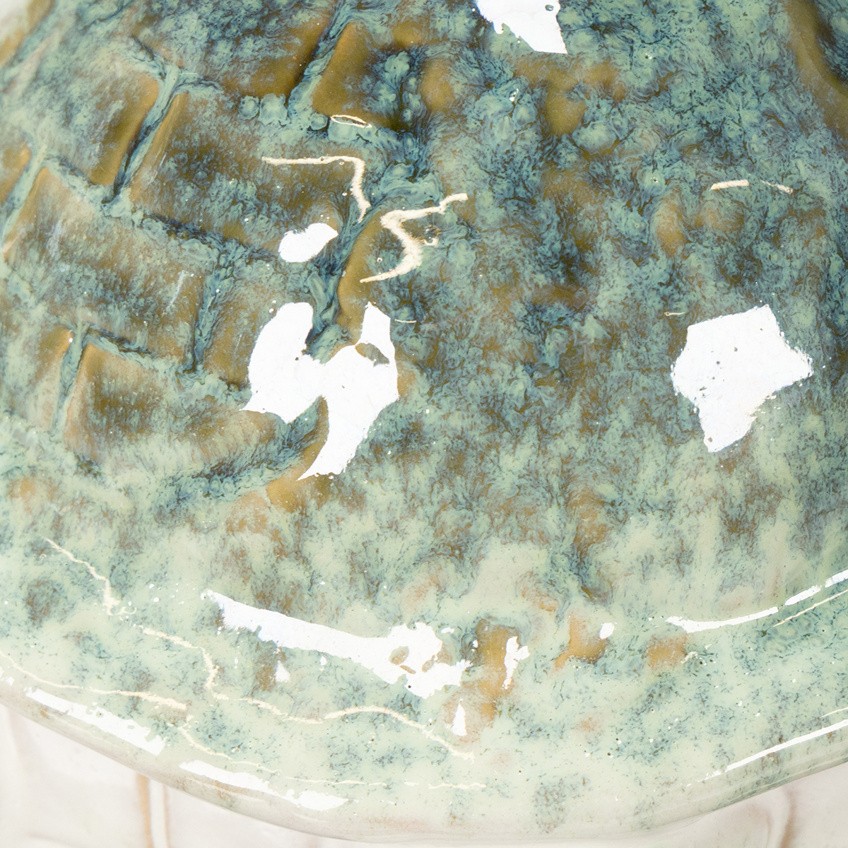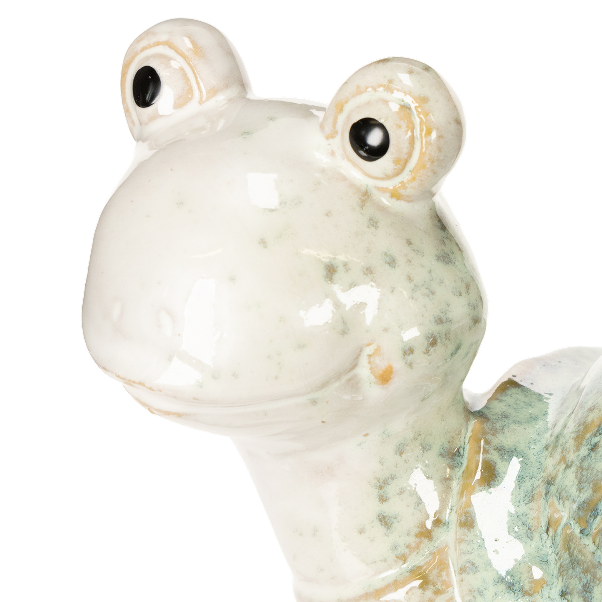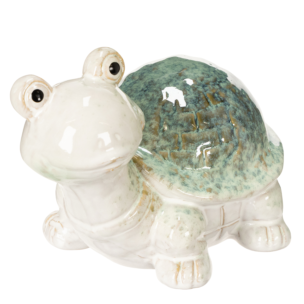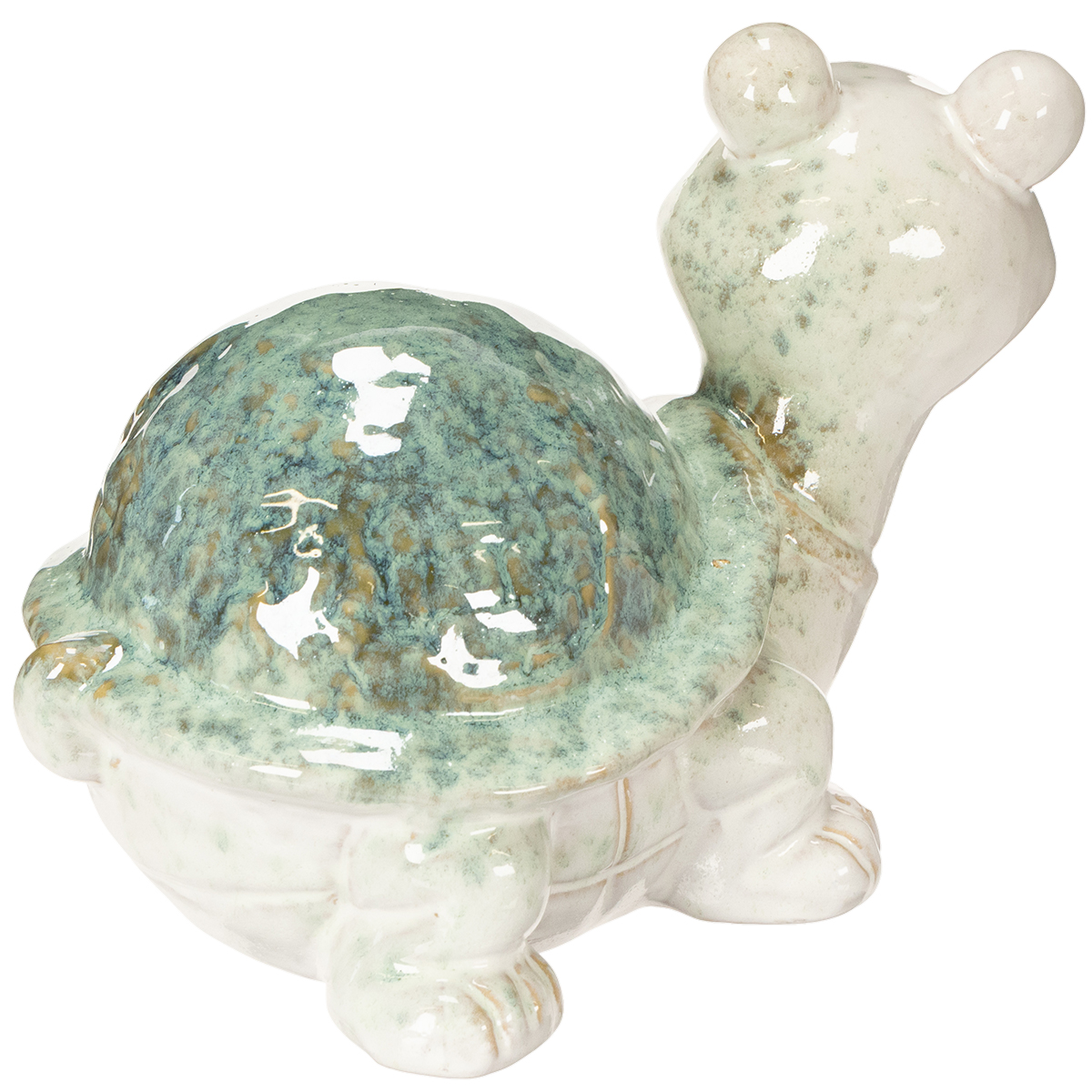 Esta tartaruga de cerâmica, feita com esmero, não só traz um toque de frescor para sua casa, como também impressiona pela alta qualidade de seu acabamento e aparência única. O casco brilha em um verde suave com um degradê natural, enquanto o corpo apresenta um elegante tom creme. Os detalhes estéticos conferem um toque fresco e harmonioso a qualquer ambiente. A peça é ideal para decorar uma prateleira na sala de estar ou uma mesa de jardim. Também fica simplesmente encantadora em uma varanda ou combinada com arranjos de plantas em uma entrada. Graças ao seu design atemporal, complementa perfeitamente estilos náuticos, modernos ou rústicos. A tartaruga de cerâmica não é resistente à geada, mas é perfeita para uso em uma estufa ou em ambientes internos. Exiba a tartaruga com vasos, floreiras ou outras peças decorativas em cores coordenadas – você ficará encantado com o resultado!
