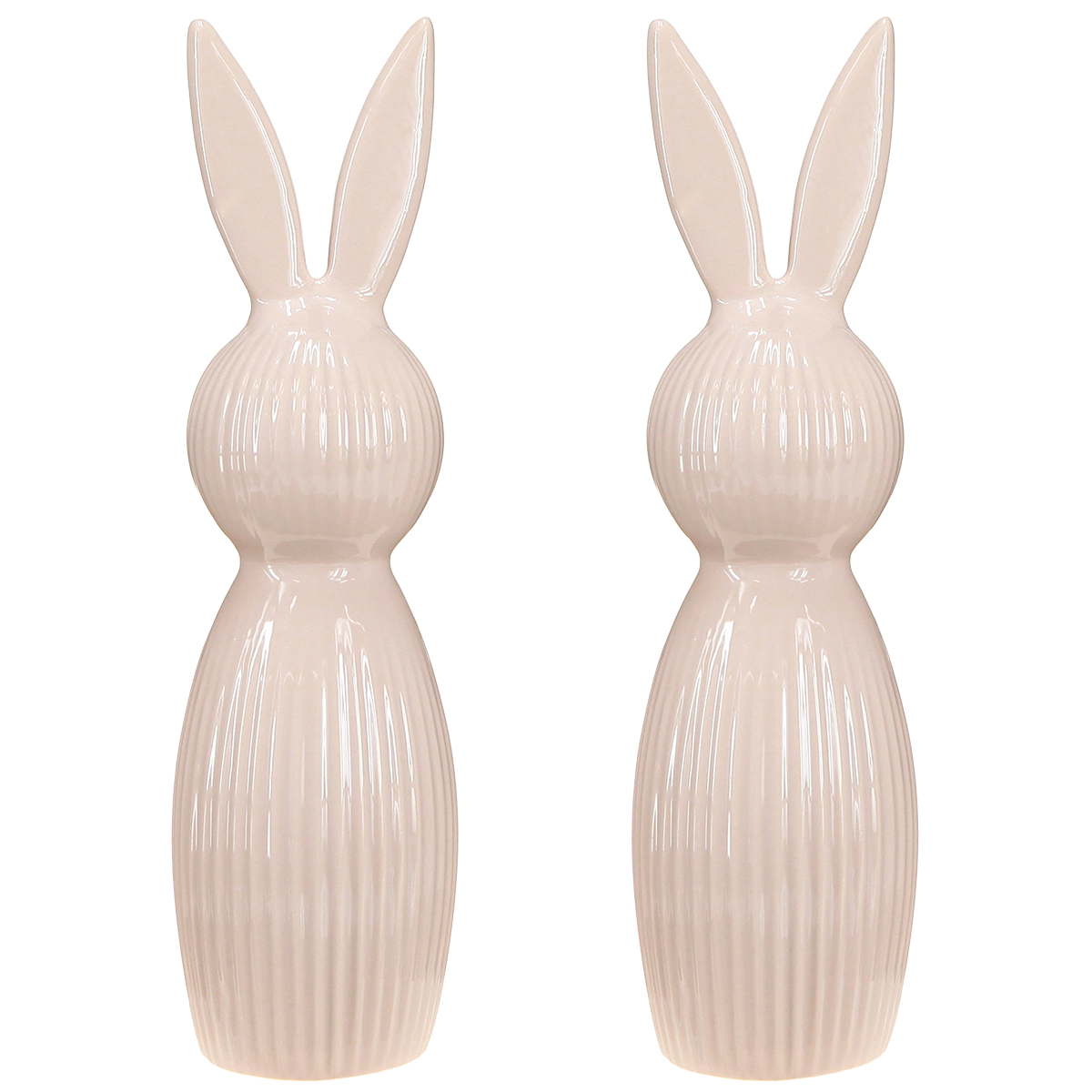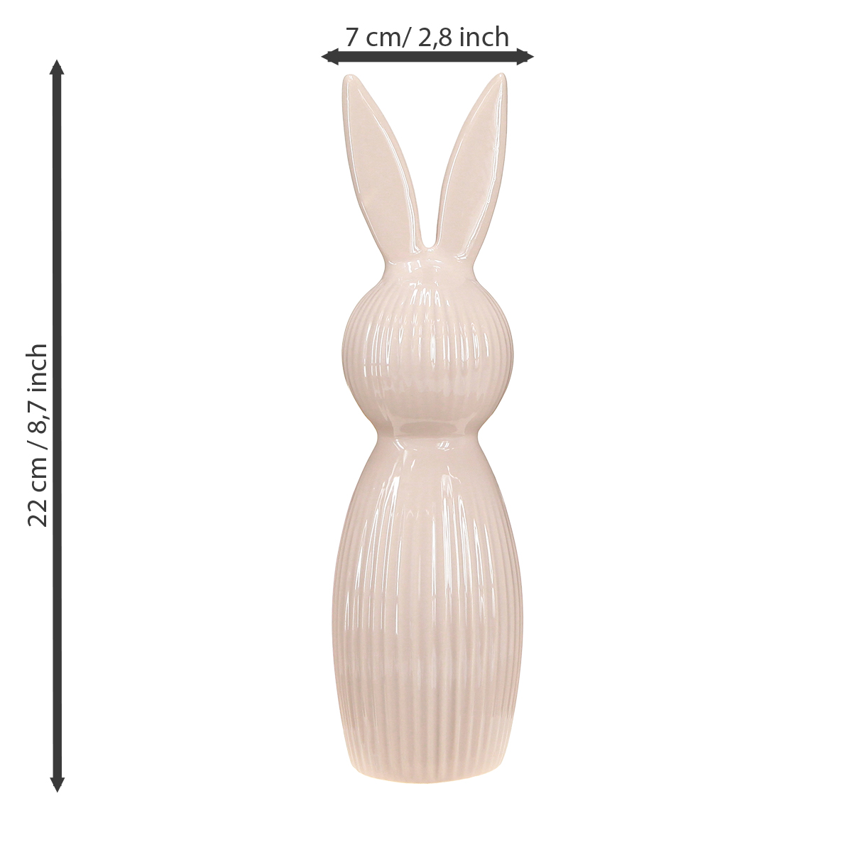 Um objeto decorativo que combina estilo e charme: este coelho de cerâmica tem 22 cm de altura e cativa com sua silhueta esguia e delicado tom rosa. Os finos sulcos verticais conferem-lhe uma textura elegante e adicionam um toque lúdico de movimento ao design. Com 7 cm de diâmetro, é compacto e encaixa-se perfeitamente até em peitoris de janelas estreitos ou prateleiras. O material cerâmico de alta qualidade impressiona pela sua solidez e durabilidade – ideal para estar sempre impecável, mesmo em áreas de grande circulação como a sala de estar ou a sala de jantar.