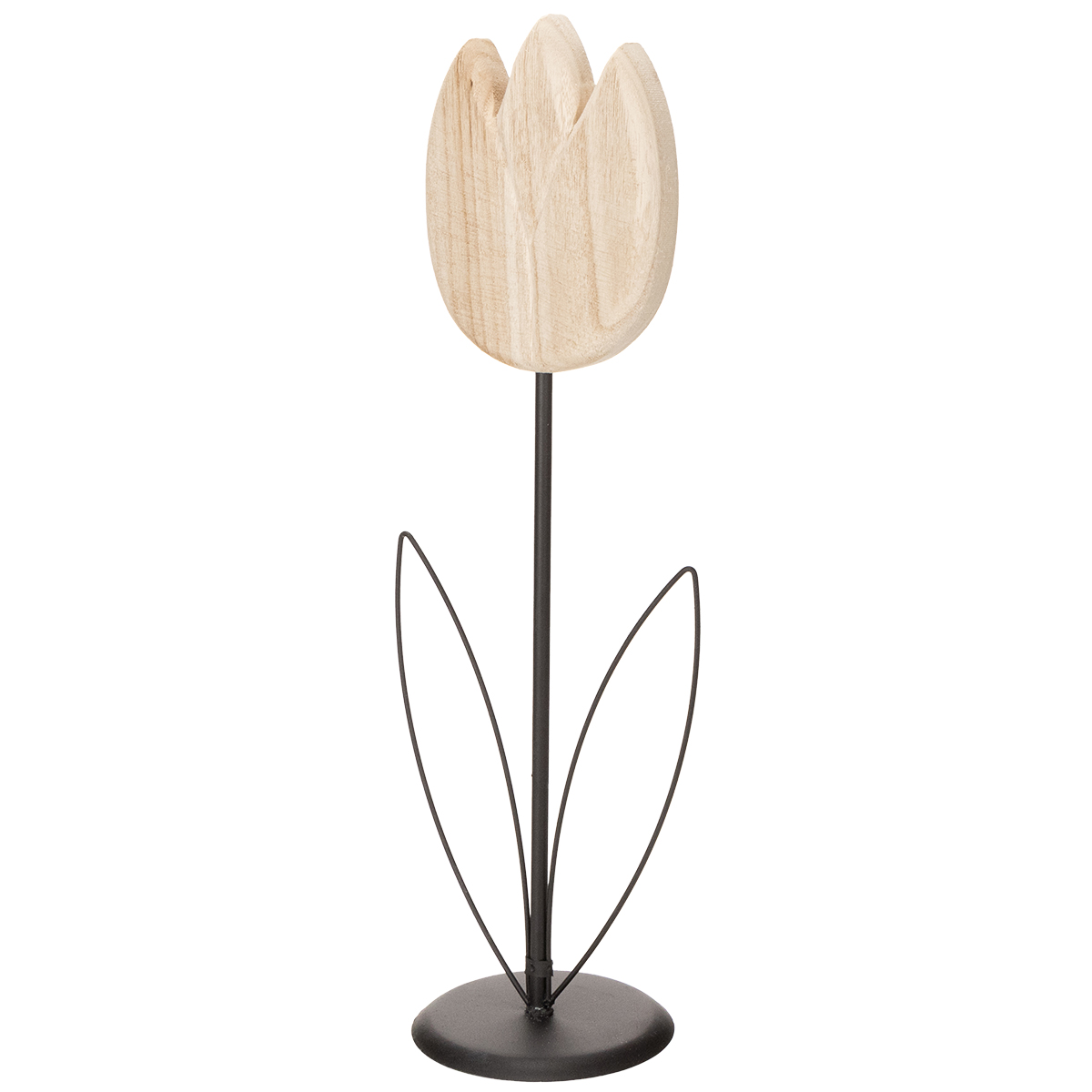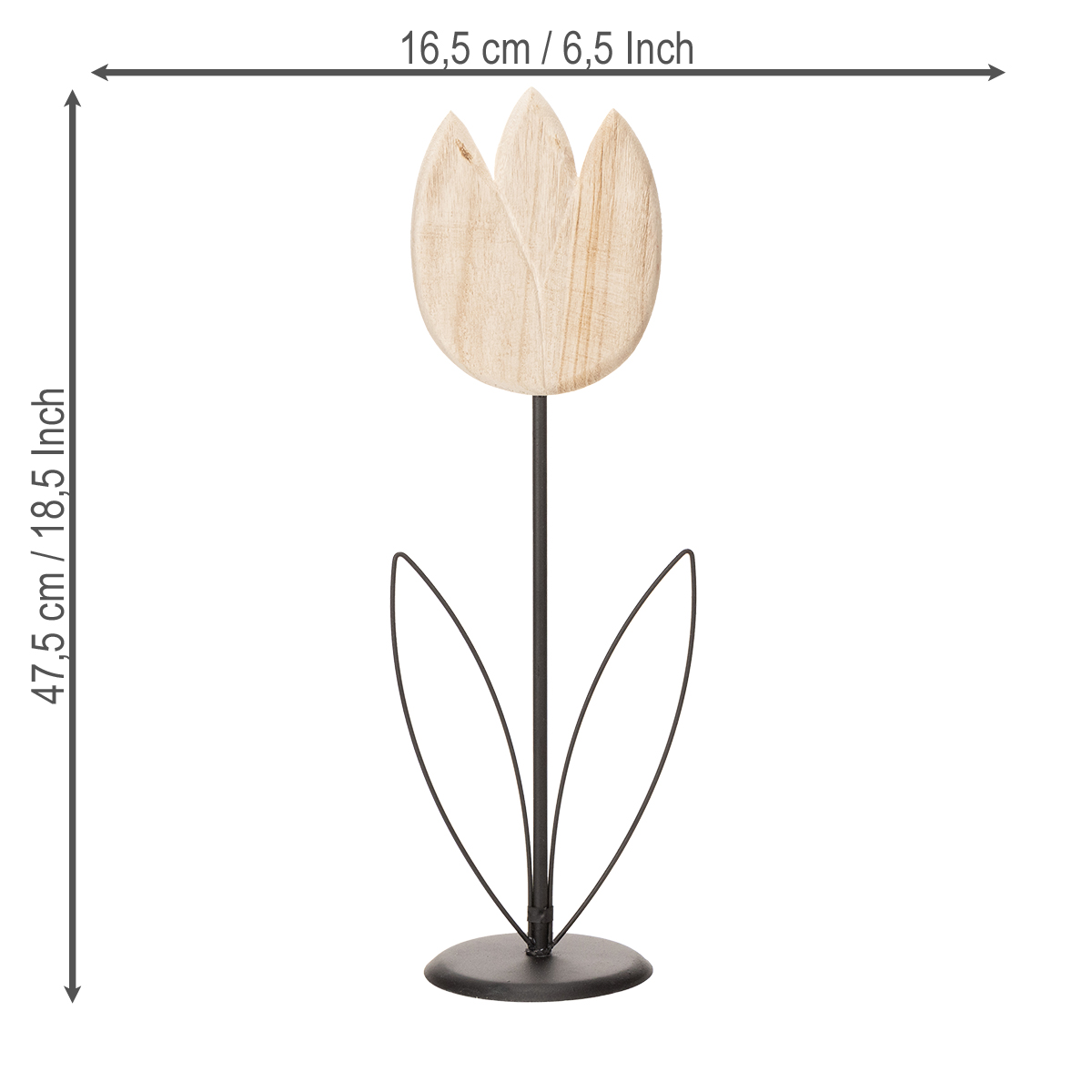 Com 47,5 cm de altura, esta estatueta de tulipa chama a atenção sem ser intrusiva. Seja no parapeito da janela, como peça central na sala de estar ou como um elegante acessório de decoração no hall de entrada, esta flor de madeira, com seu acabamento meticuloso, certamente atrairá olhares. A madeira natural da cabeça da tulipa exala aconchego, enquanto as delicadas folhas de metal preto conferem à estatueta um toque moderno. Uma combinação maravilhosa entre a natureza e o charme urbano.