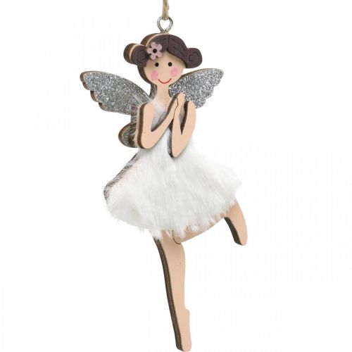 Os pequenos elfos decorativos têm asas prateadas brilhantes e vestem roupas fofas como penas em rosa escuro, turquesa e branco. Os elfos da primavera amarraram seus cabelos castanhos em um coque e o decoraram com uma pequena flor. Um rosto amigável é finamente pintado em cada decoração de madeira. As fadas das flores parecem estar dançando e pulando alegremente.
