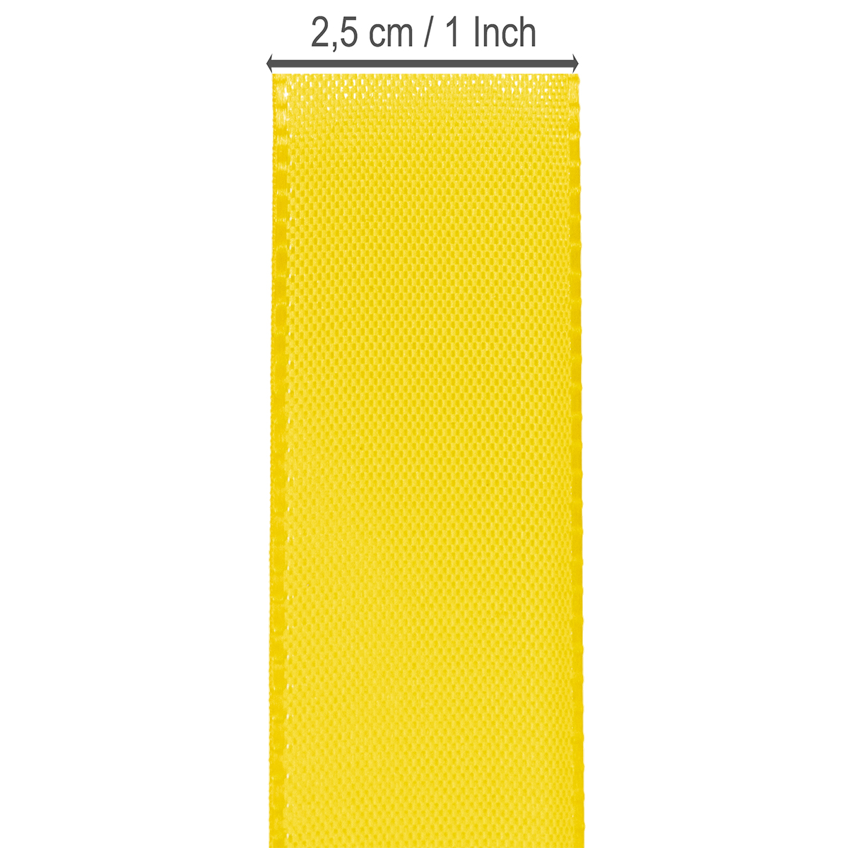 A fita para presente e decoração em amarelo tem cerca de 25 milímetros de largura e cerca de 50 metros de comprimento.