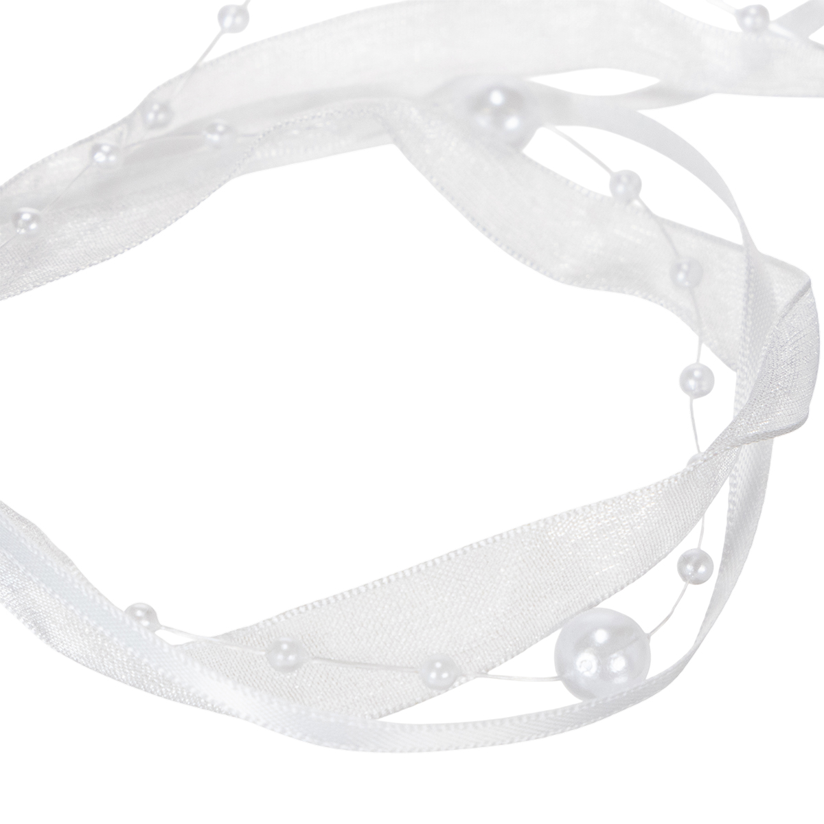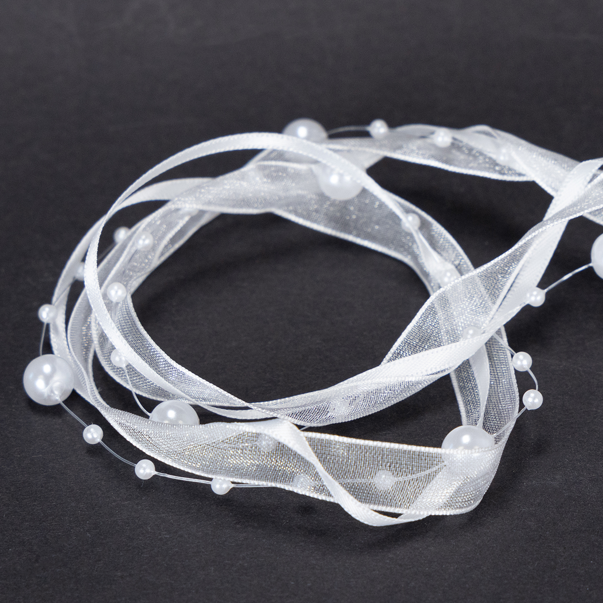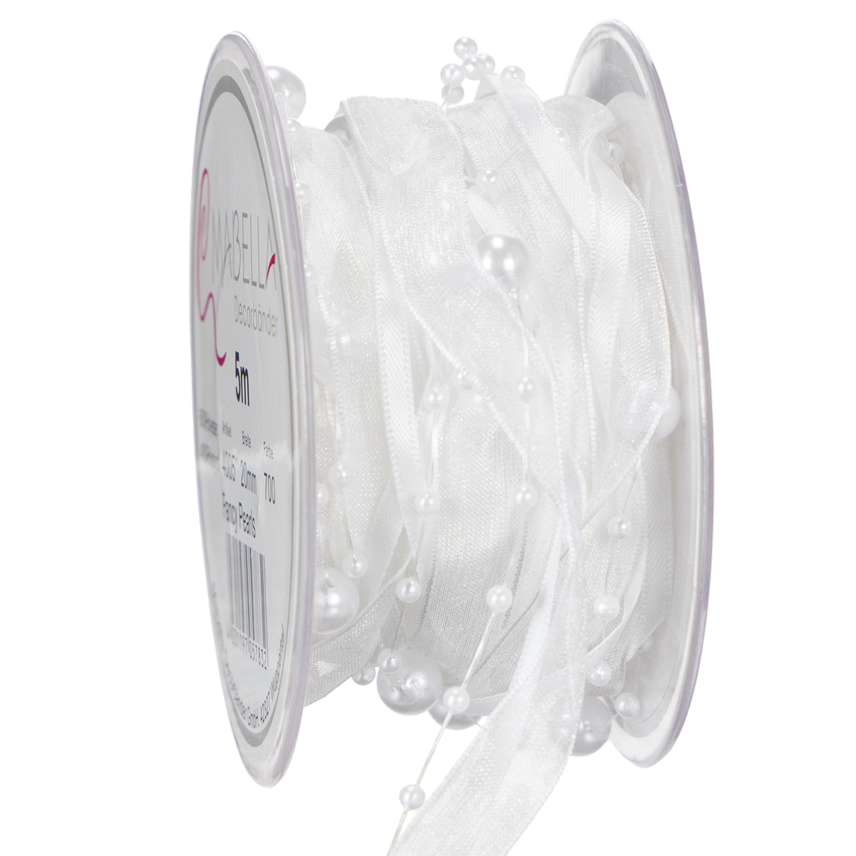 A aliança na cor branca tem cerca de 5 metros de comprimento e é enrolada em um rolo de plástico. A largura é de cerca de 20 milímetros e as contas têm cerca de 0,2 a cerca de 0,8 centímetros de diâmetro.