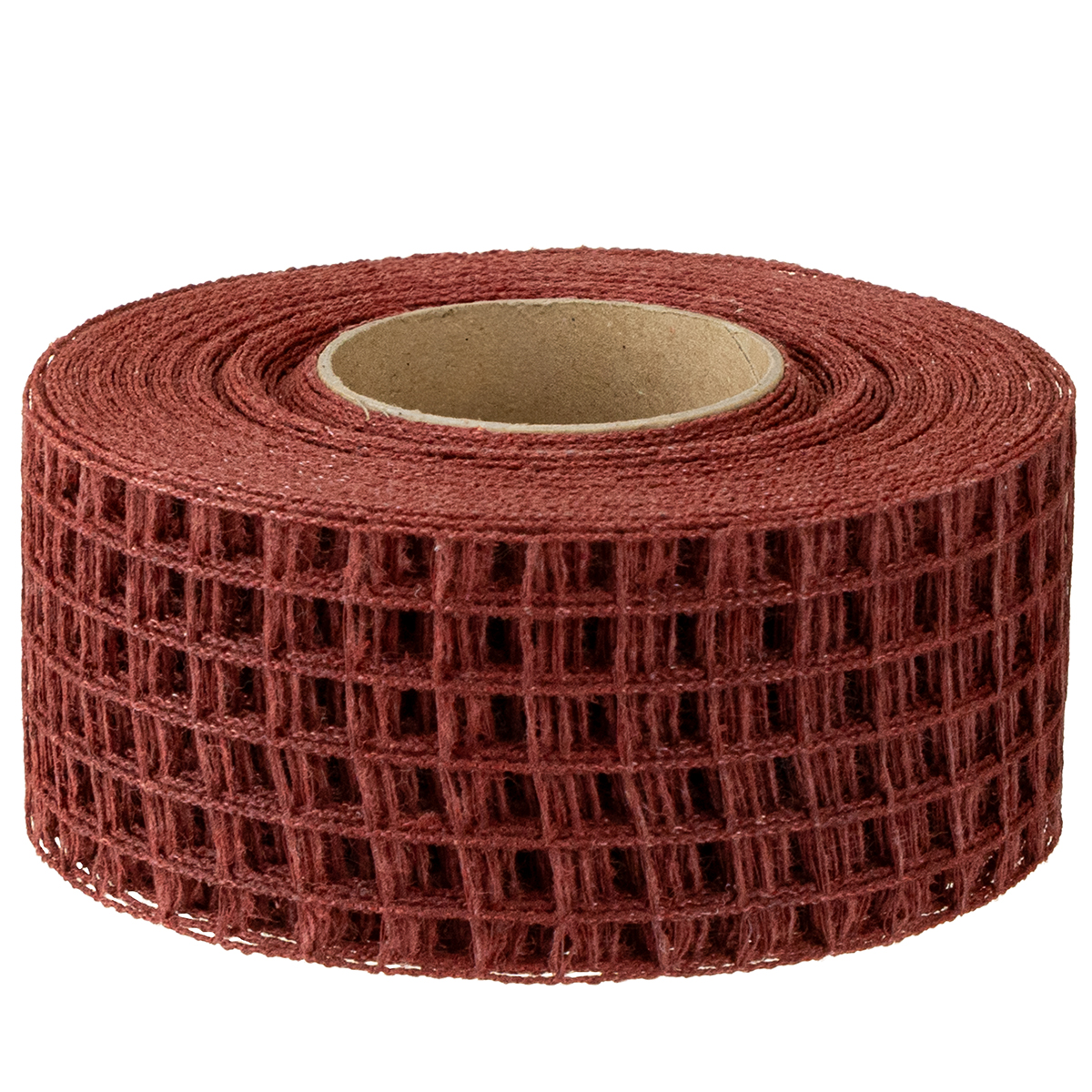 O fundo ainda pode ser visto através da malha grosseira e a fita também é larga o suficiente para colocar um vaso de mesa com flores. Devido à cor vermelho-bordô escuro, você também pode usar a fita de tecido para ocasiões comemorativas e decorar uma lanterna ou uma floreira enrolando a fita de malha em volta dela e fixando-a com um pouco de cola ou agulha. E se você quiser fazer um arranjo de flores, por exemplo, você também pode usar esta fita para cobrir a superfície interna e como suporte para arame e grampos!