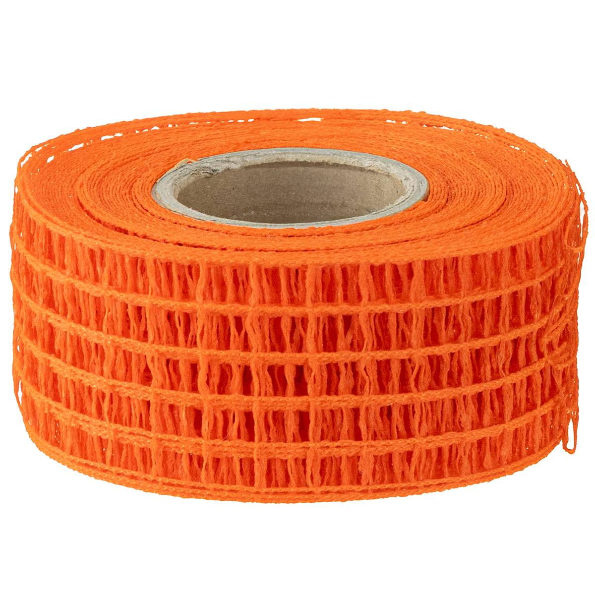 A fita de grade laranja é oferecida como um pequeno rolo de cerca de 10 metros de comprimento. A fita em si tem cerca de 4,5 polegadas de largura.