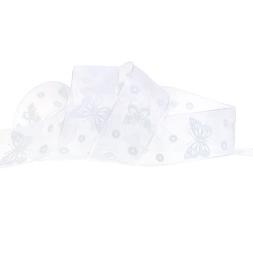 A fita de organza branca com borboleta tem cerca de 25 milímetros de largura e cerca de 20 metros de comprimento. A fita inteira é enrolada em um rolo de plástico, que você também pode pendurar em um dispensador.