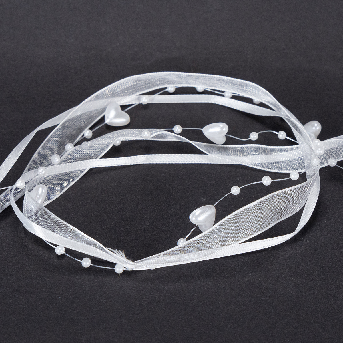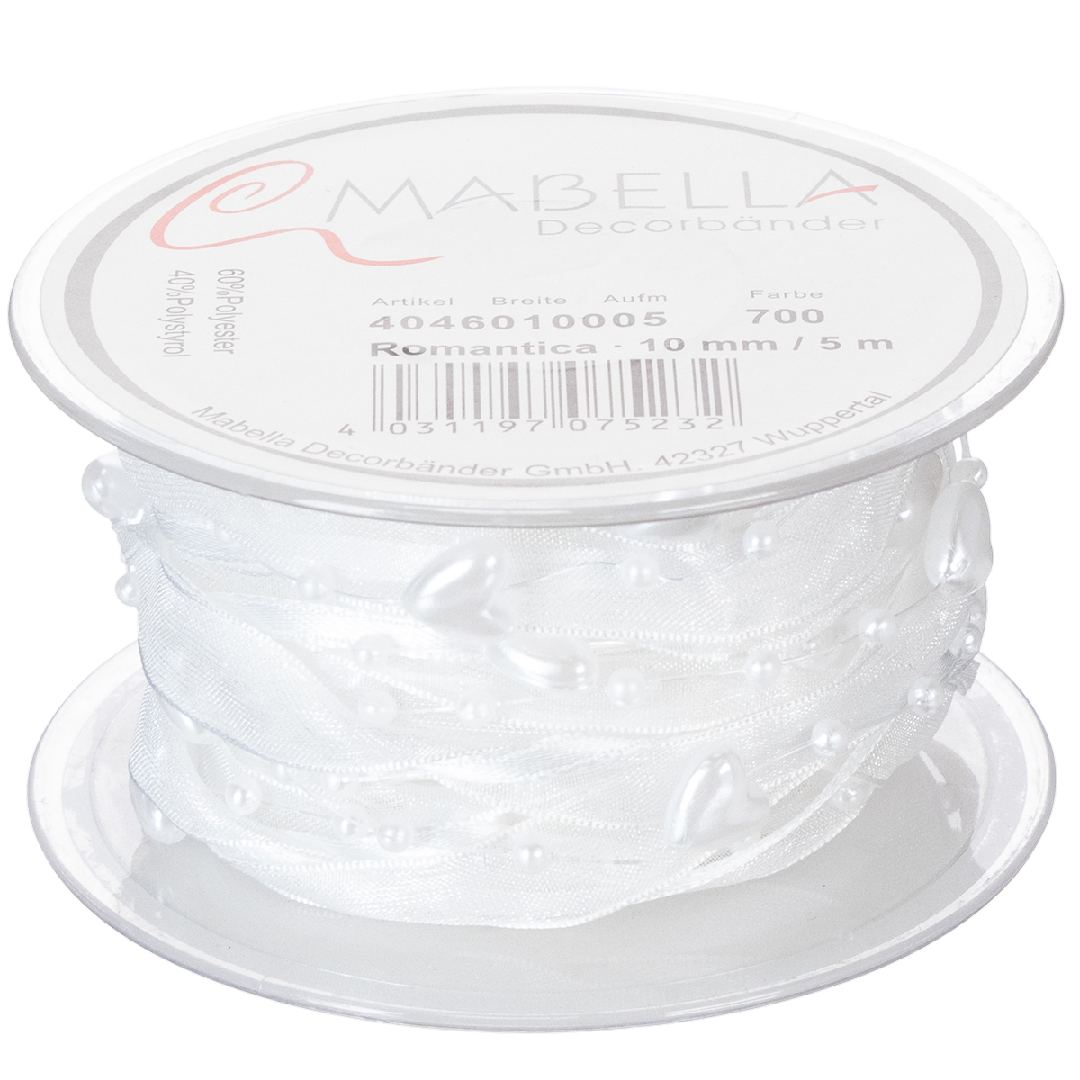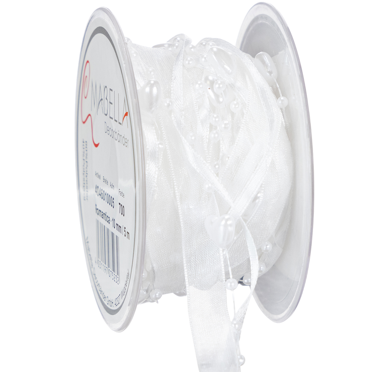 Fita de organza branca para decoração de casamento, 10mm x 5m, com corações e pérolas.
