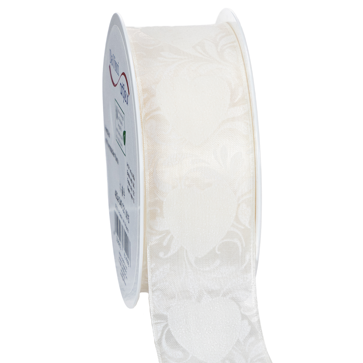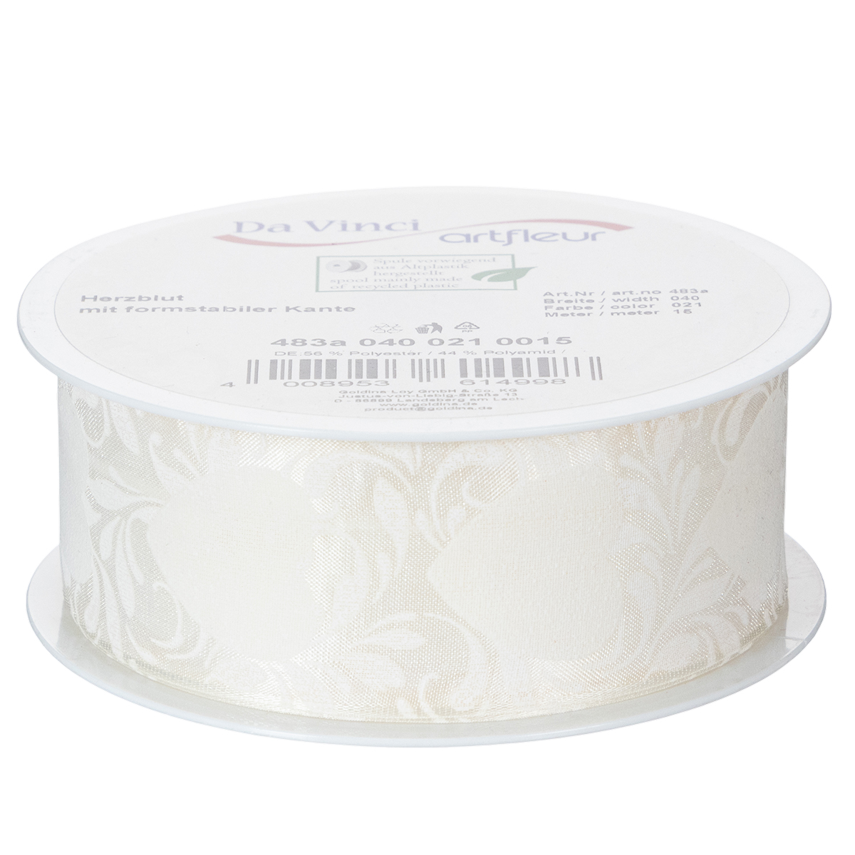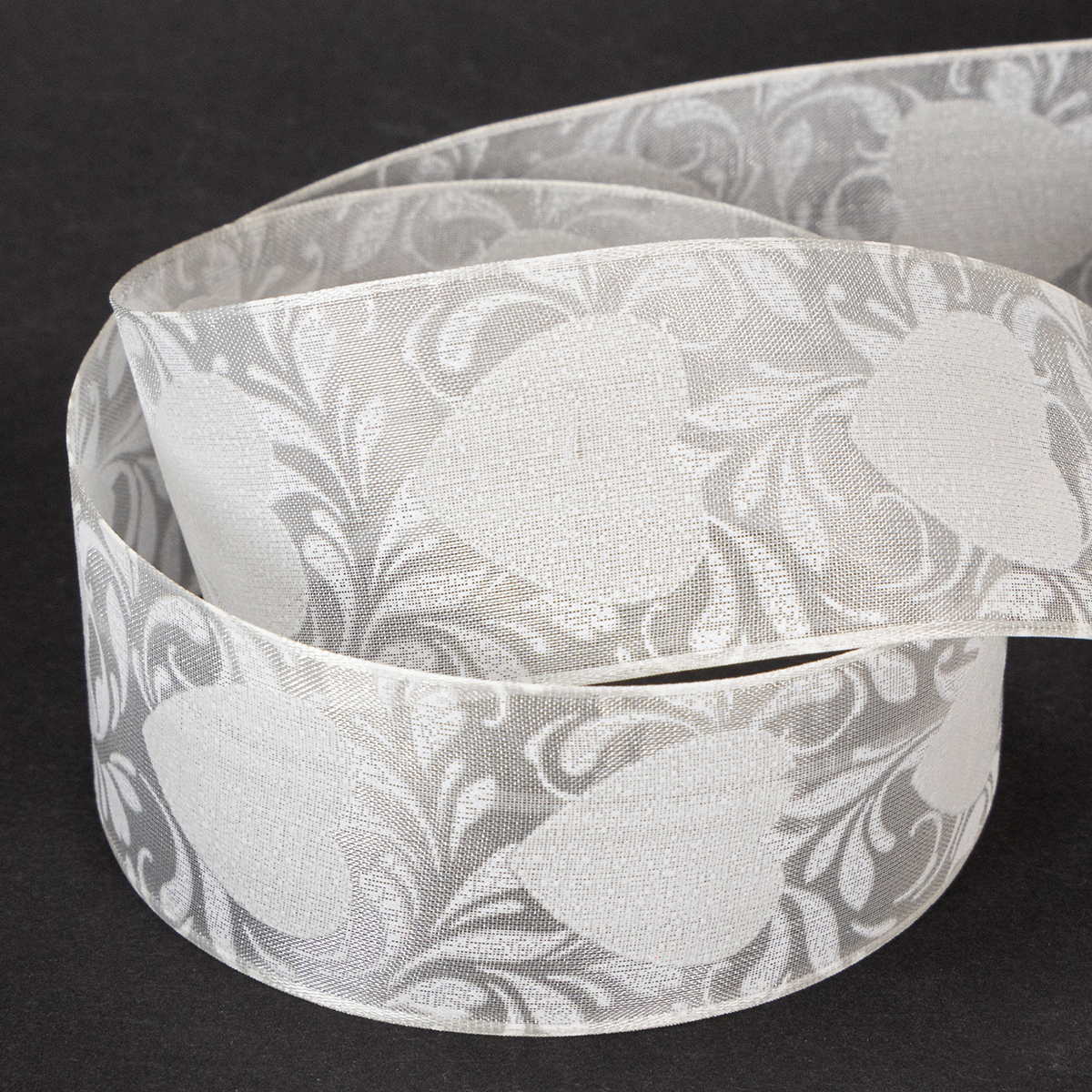 Os delicados corações são cercados por galhos folhosos como flores e estampados no tecido de organza transparente, conferindo à fita um visual sofisticado que lembra renda. O tom creme quente da fita decorativa é atemporal e ao mesmo tempo transmite uma certa nostalgia.