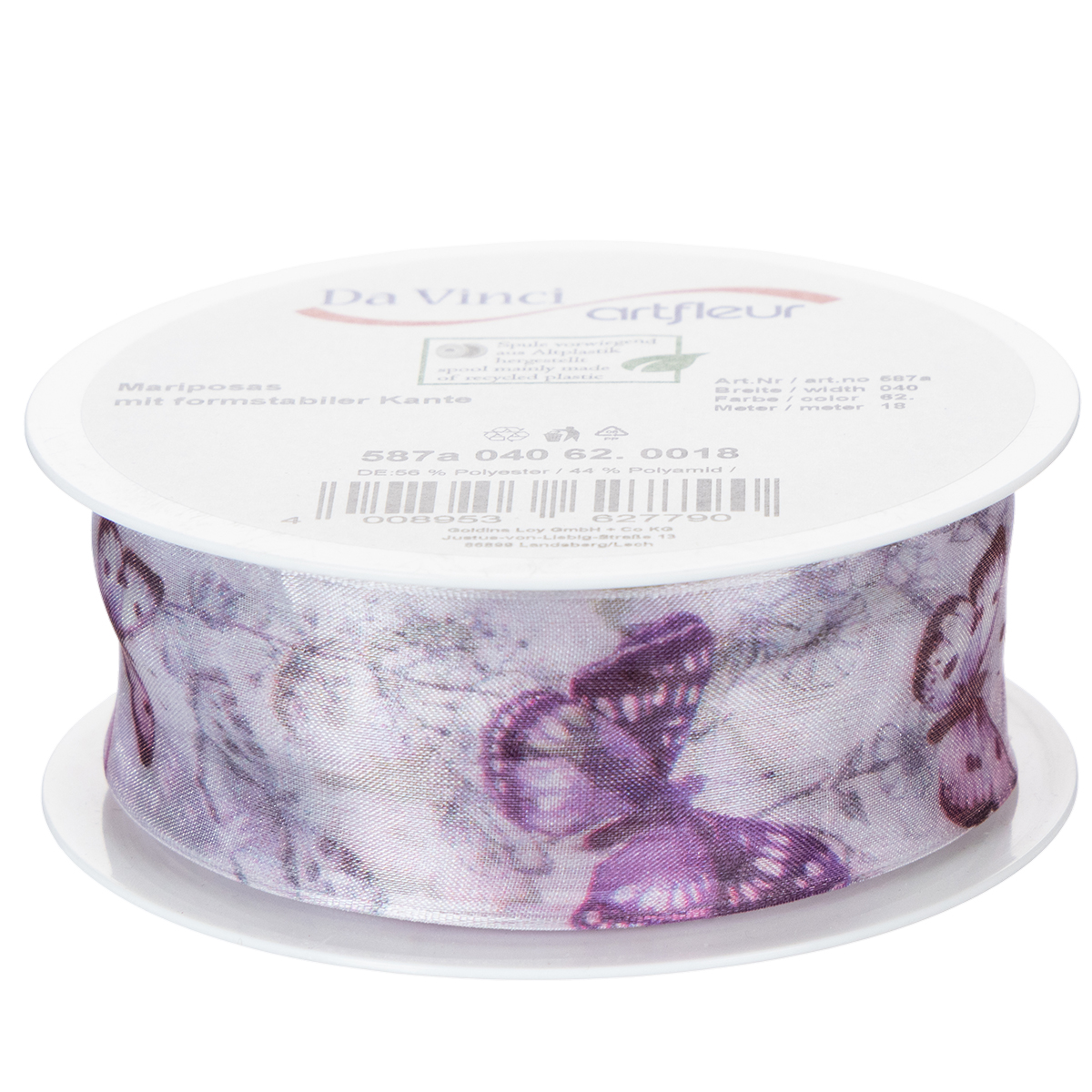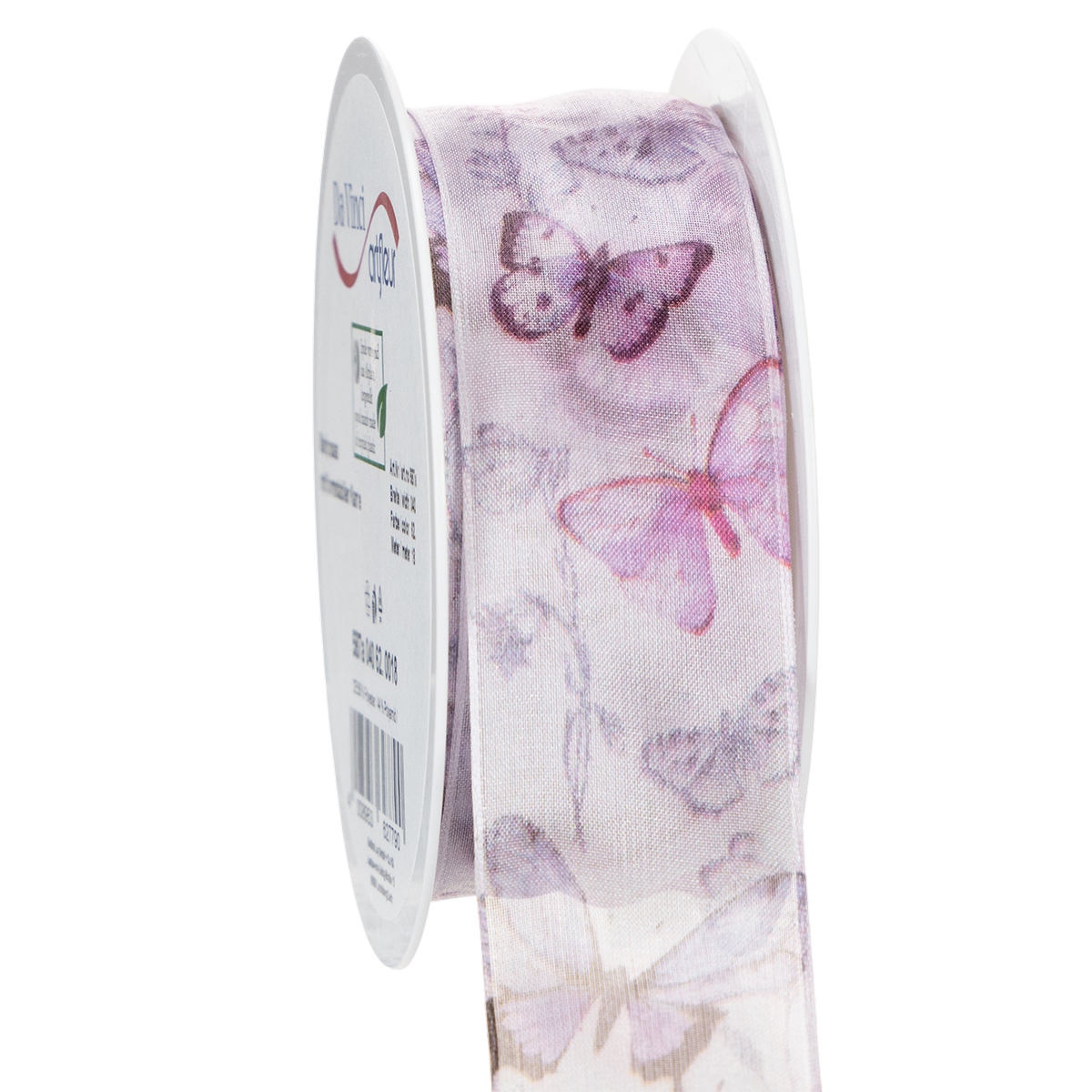 As borboletas retratadas com grande detalhe pertencem a espécies diferentes, exóticas e particularmente bonitas, o que faz com que o motivo pareça muito sofisticado. A larga fita de chiffon tem um visual delicado e leve graças ao tecido de organza transparente, enquanto a borda garante que os laços mantenham sua forma.