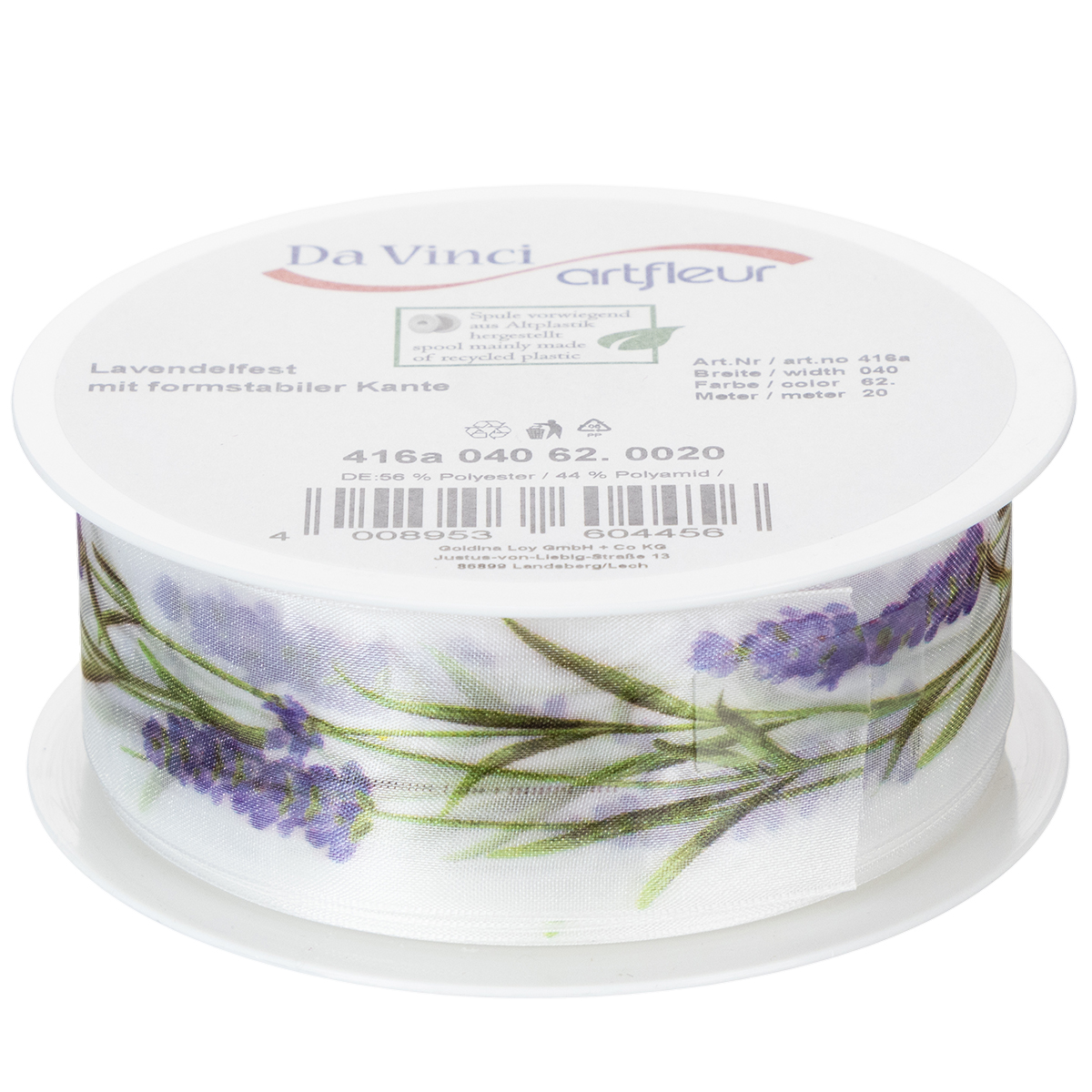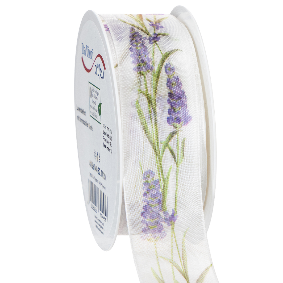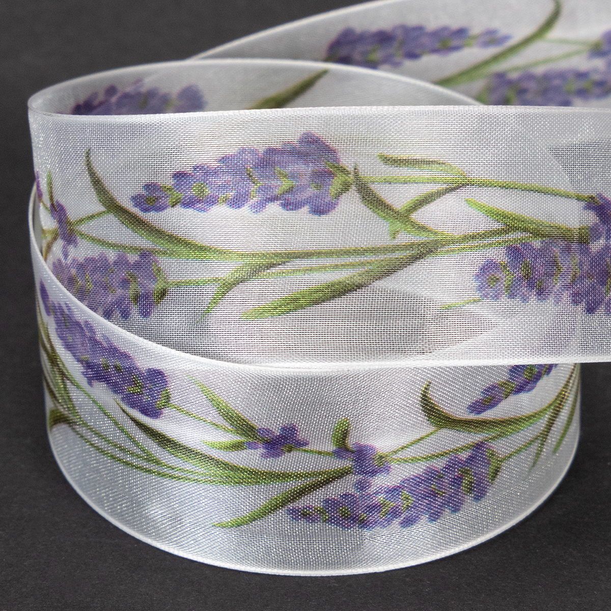 O motivo lavanda parece fresco e colorido no fundo branco da fita de organza. Com seu tecido de organza transparente, a fita de chiffon é leve e tem um brilho característico, enquanto as bordas que mantêm a forma garantem que os laços tenham uma aparência pitoresca.