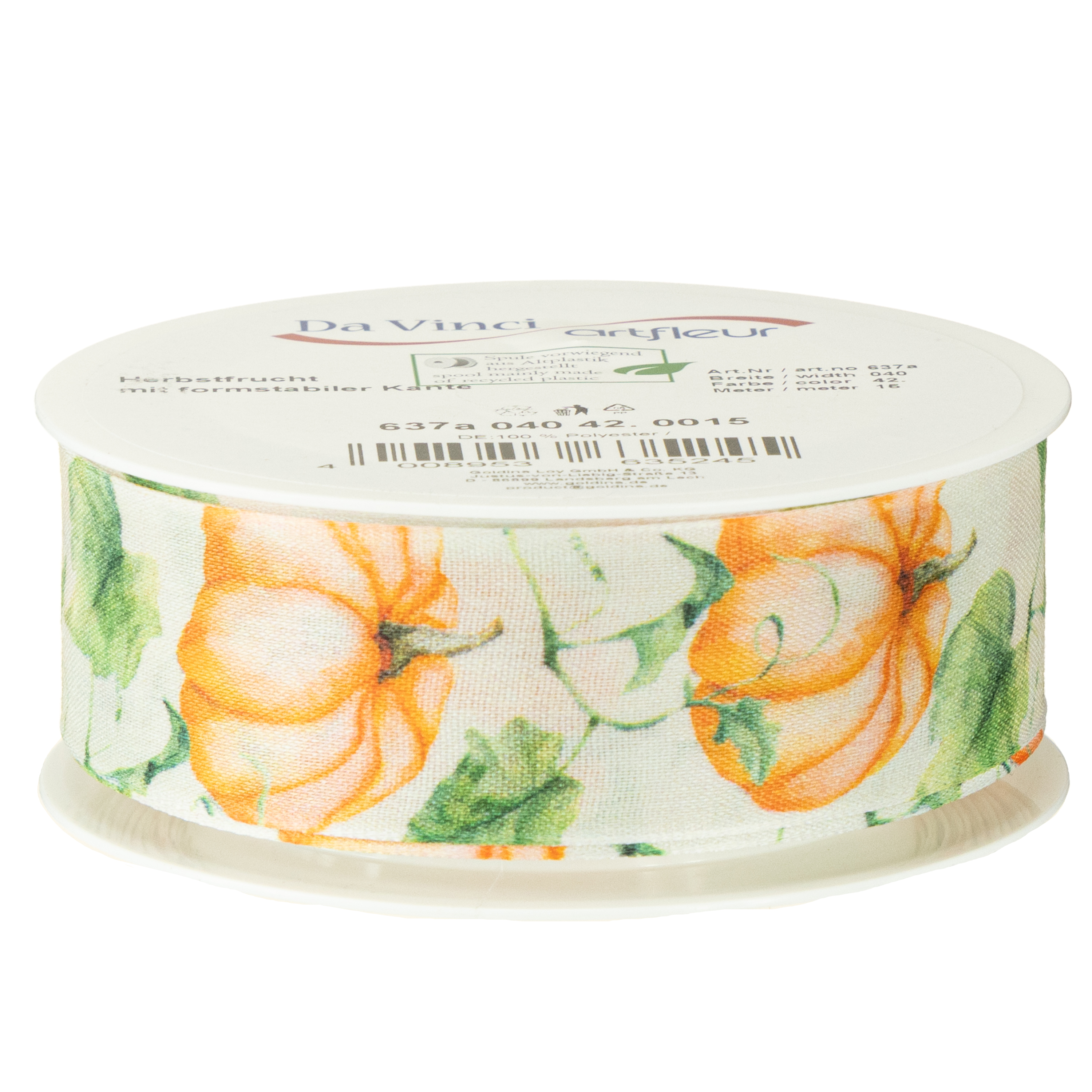 A fita é impressa com um motivo detalhado de abóbora. Folhas e gavinhas estão dispostas de forma pitoresca em torno da fruta laranja do outono. A fita decorativa também prova ser um produto de qualidade graças à ourela dimensionalmente estável.