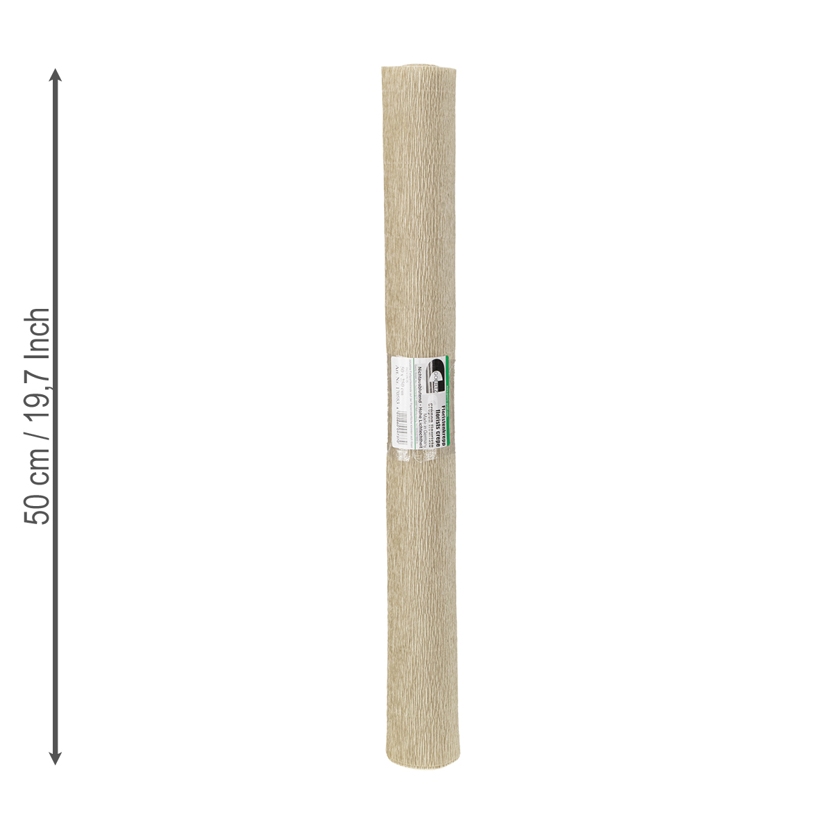 O papel crepom florista natural mede cerca de 50 x 250 centímetros. É enrolado em um rolo que pesa aproximadamente 160 gramas.