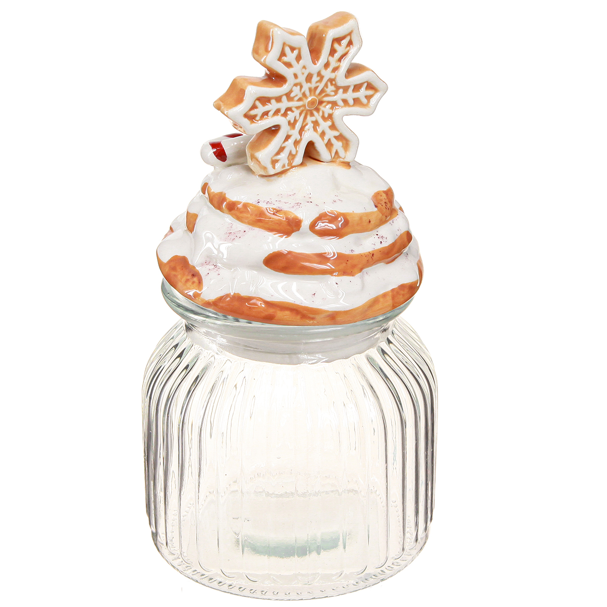 A bomboneira de vidro com tampa de cerâmica traz pão de gengibre com cobertura, biscoito em formato de floco de neve e bengala de doce.