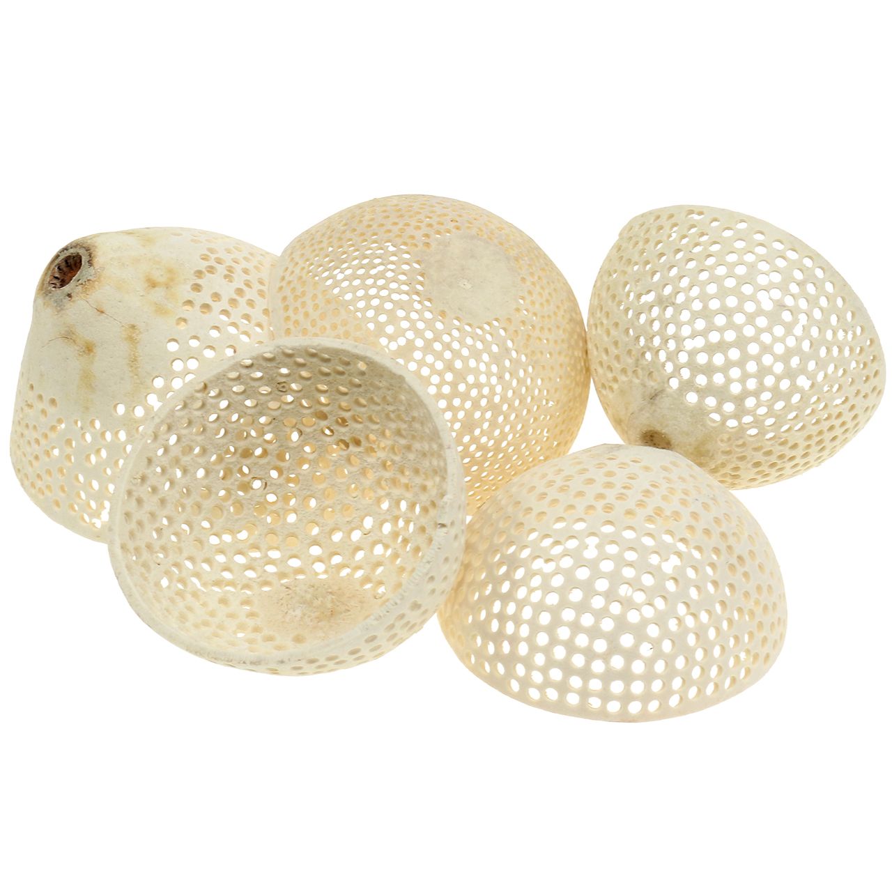 Os frutos secos branqueados tipo Bell Cup estão disponíveis em conjuntos de 10 peças. Cada cópia é feita inteiramente de madeira. O diâmetro varia entre aproximadamente 8,5 e 11 centímetros.