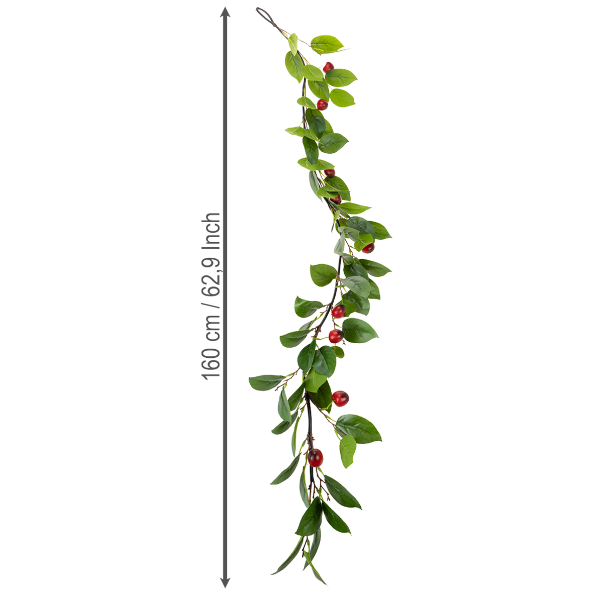 Graças ao seu design flexível, você pode drapejar, enrolar ou dispor a guirlanda como desejar. O material resistente garante que ela mantenha a forma, enquanto o design vibrante com cerejas e folhas artificiais cria um visual autêntico. Complemente sua decoração com acessórios que combinem, como vasos, flores artificiais ou coroas, para criar um efeito geral harmonioso.