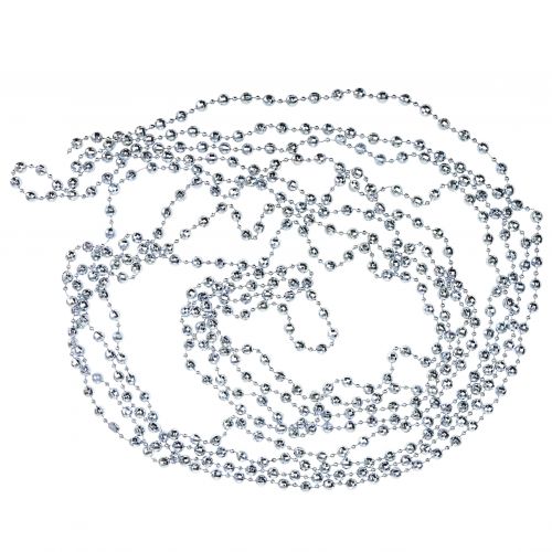 A decoração de Natal em forma de uma guirlanda de pérolas azul claro tem cerca de 7 metros de comprimento. O diâmetro das pérolas individuais é de cerca de 1 centímetro.