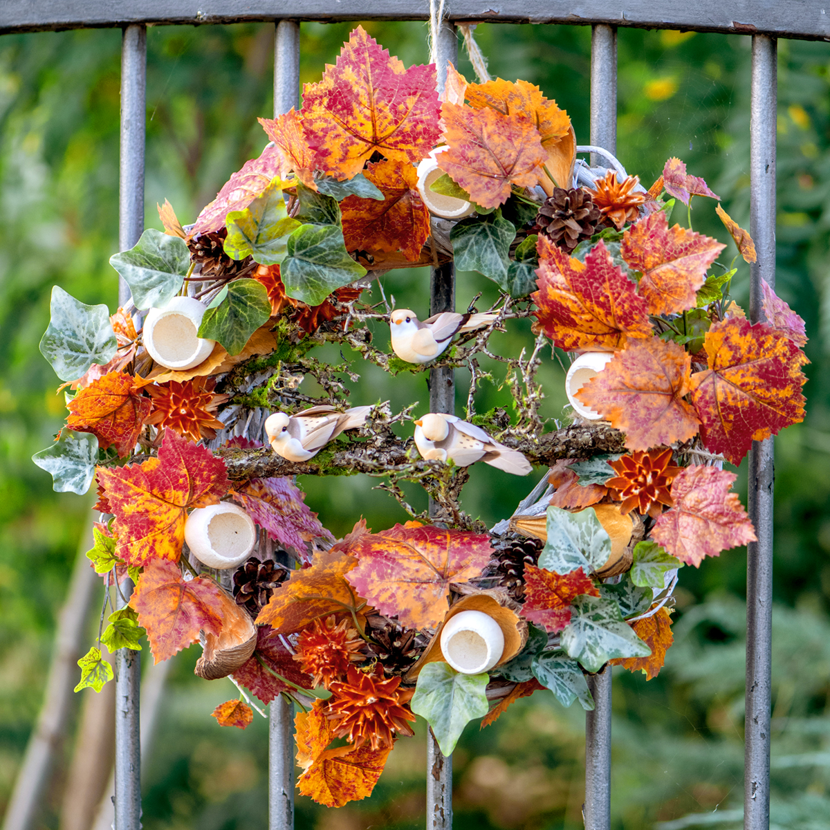 O diâmetro de cerca de 30 centímetros e a altura de cerca de 9,5 centímetros fazem da guirlanda um elemento versátil no design do seu espaço residencial. Pode ser exibido de forma atraente em uma mesa, bem como em uma porta ou parede.