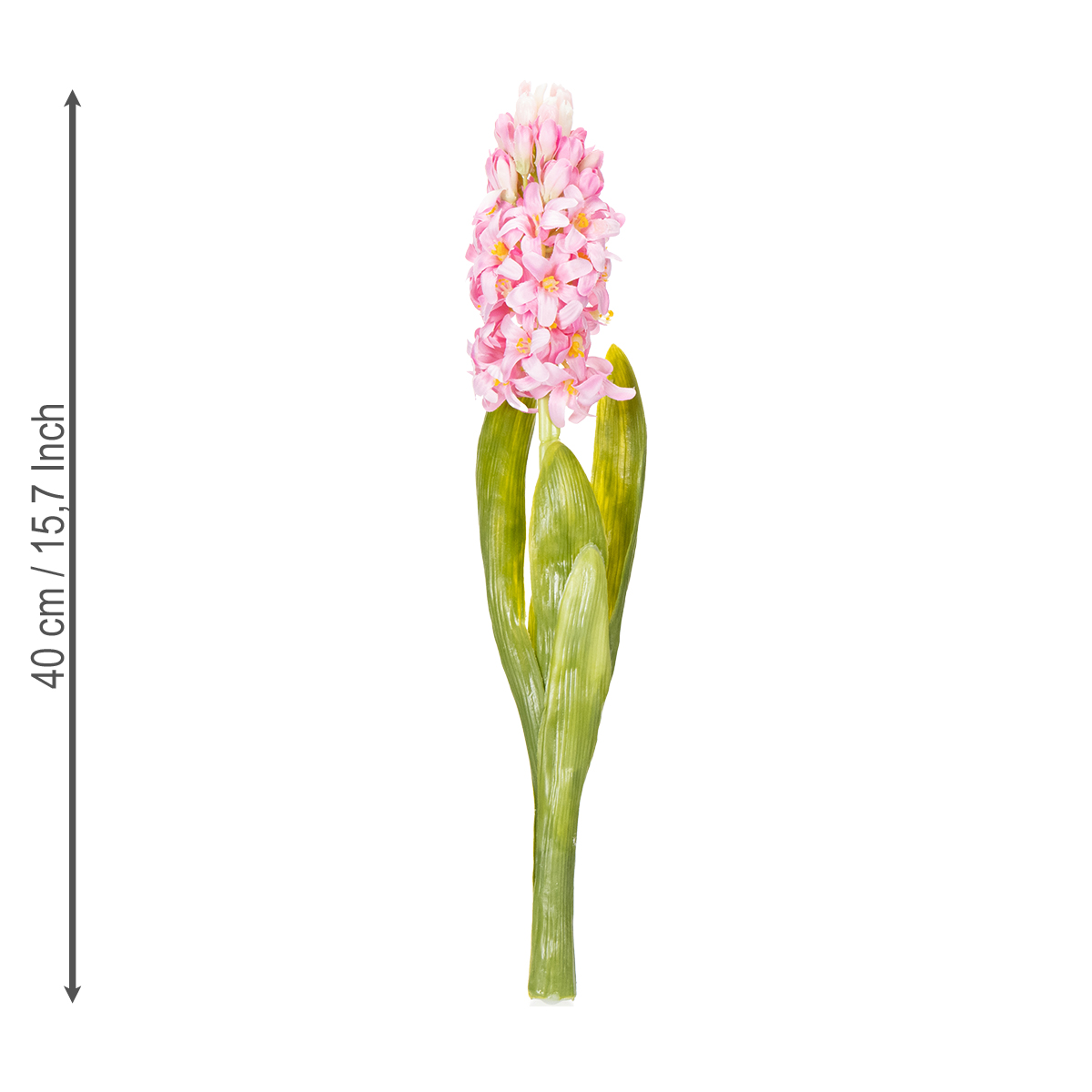 O jacinto rosa com efeito de toque real é feito de plástico e tem uma altura total de cerca de 40 centímetros. O diâmetro da flor é de cerca de 7 centímetros.