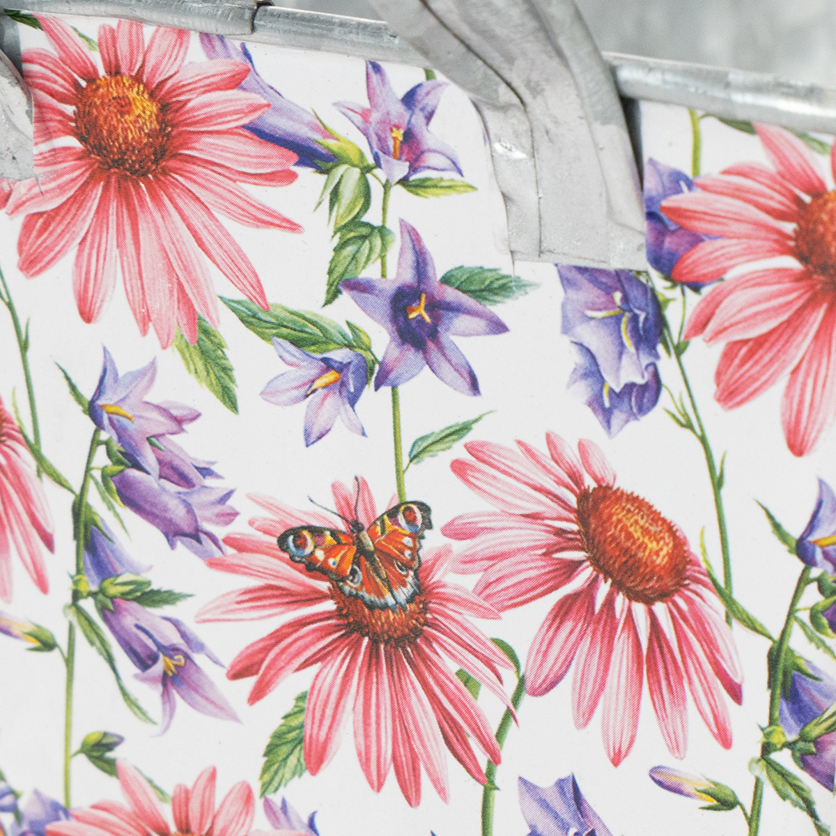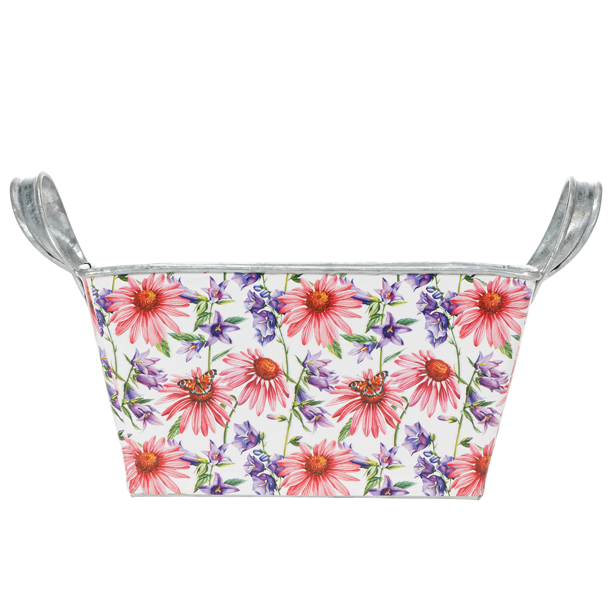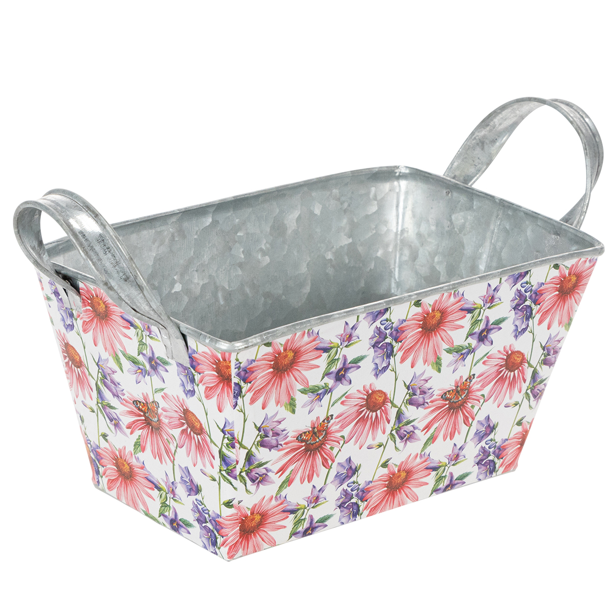Flores de primavera rosa e lilás em um fundo branco criam um quadro variado e otimista. O motivo da flor foi impresso em uma folha resistente, que por sua vez adere ao recipiente de zinco. Desta forma, o interior com o zinco prateado forma um forte contraste na decoração primaveril.