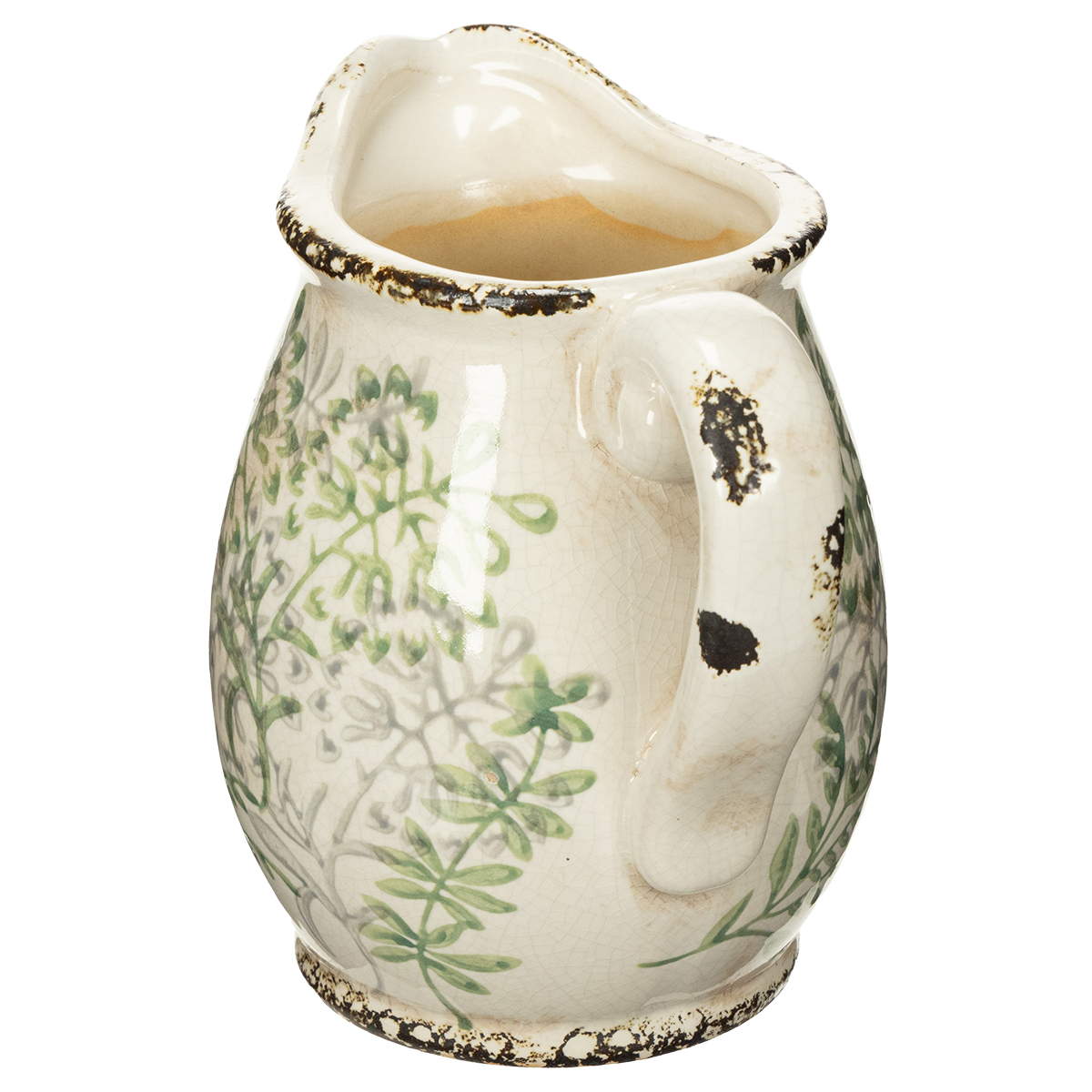 Este jarro vintage para plantas é um verdadeiro coringa na decoração. Com seu formato atemporal, acabamento rústico e detalhes encantadores, ele se integra perfeitamente a qualquer casa em estilo campestre. Você pode usá-lo como um vaso decorativo que exibe suas plantas com charme. Imagine este jarro de cerâmica sobre uma pequena mesa de sala de estar, repleto de flores frescas. Suas dimensões – 16 cm de altura com 13 cm de diâmetro – o tornam ideal para arranjos menores, sem parecer sobrecarregado. Para um visual mais natural, você pode plantar ervas frescas. Manjericão, salsa ou alecrim encontrarão um lar elegante aqui, seja na cozinha ou no pátio. A combinação de branco e verde cria um efeito harmonioso e traz um toque de frescor à sua decoração. Este jarro nostálgico para plantas combina particularmente bem com outros elementos rústicos, como móveis de madeira ou tecidos shabby chic. Também é uma ótima ideia de presente, seja para amantes de plantas ou fãs do estilo campestre.