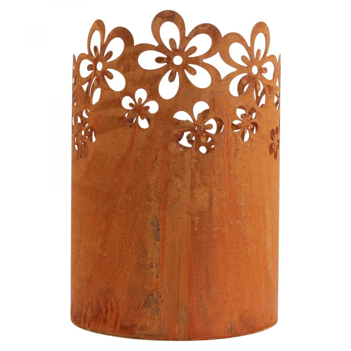 Você pode usar esta decoração de metal de várias maneiras. Insira uma vela de pilar e você já tem uma lanterna. A decoração de metal em aparência de ferrugem também pode ser usada como floreira para flores artificiais e secas e arranjos de flores.O que há de especial na lanterna de metal é o padrão floral que decora o terço superior e atua como uma borda decorativa. A abertura é projetada em ângulo, de modo que a decoração de metal tenha uma altura diferente. O motivo da flor tem cinco pétalas cada.
