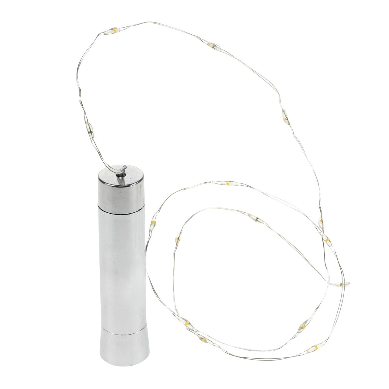 A luz LED para garrafas em branco quente tem um comprimento total de aproximadamente 82 centímetros com a tampa. Um total de 15 pequenos LEDs assentam na cadeia de luzes de aproximadamente 73 centímetros de comprimento. A tampa prateada tem um diâmetro de cerca de 2 centímetros na parte superior e afunila ligeiramente em direção à parte inferior para que se encaixe no gargalo de uma garrafa de vinho, por exemplo. Você também precisa de uma bateria AA para as luzes da garrafa.