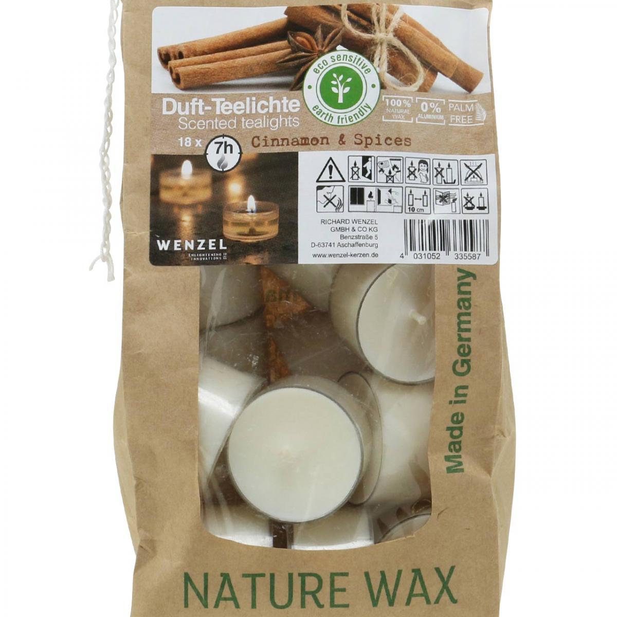 As velas perfumadas de canela são feitas de cera natural, sem óleo de palma e sem alumínio, 100% fabricadas na Alemanha. As velas perfumadas são certificadas RAL e têm um tempo de queima de cerca de 7 horas.