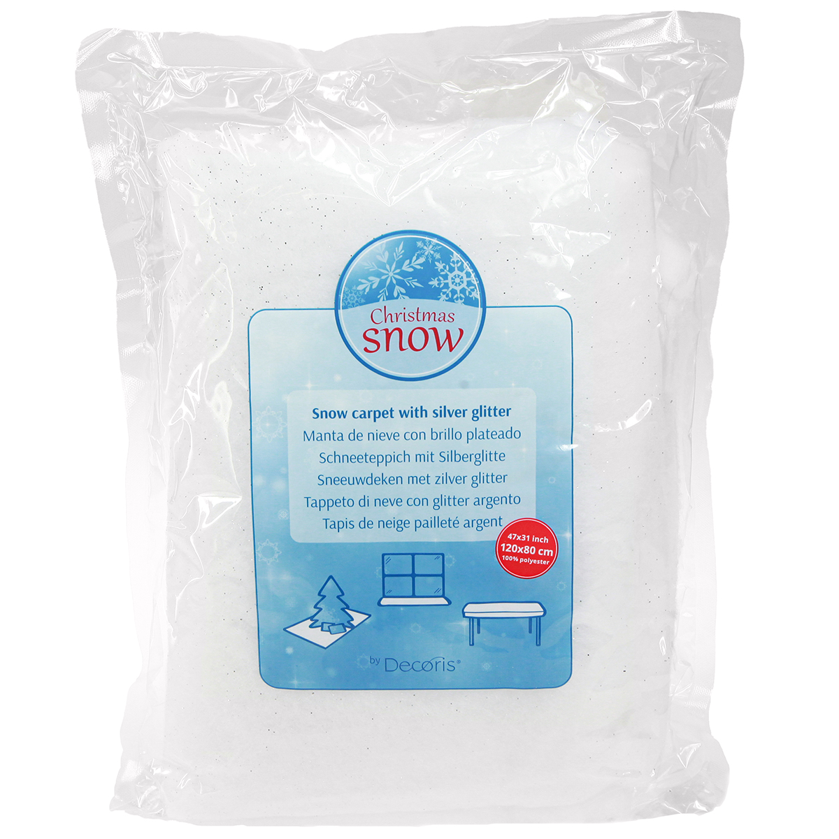 A cobertura de neve com mica mede aproximadamente 120 × 80 centímetros. Isto permite cortar o comprimento e a largura e adaptá-lo à sua decoração. Mas figuras elegantes como estrelas, a lua ou flocos de neve também podem ser facilmente recortadas deste manto de neve e coladas em presentes ou cartões de Natal, por exemplo.