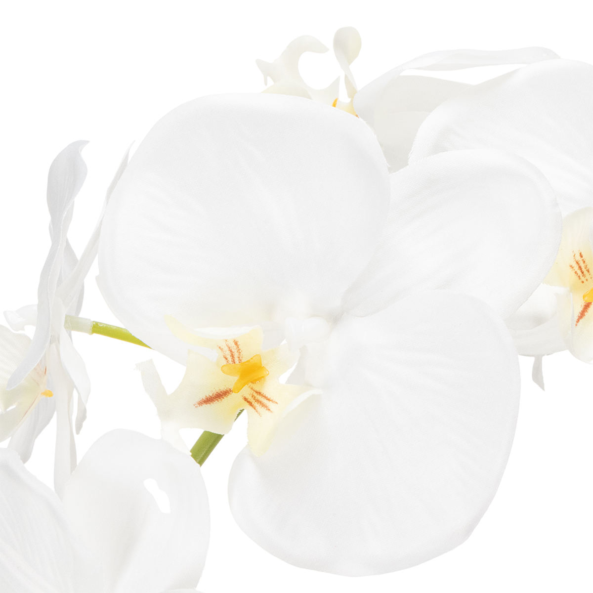 As orquídeas sempre representaram elegância, graça e beleza exótica. A cor branca simboliza pureza, paz e perfeição. Uma orquídea artificial como esta não só traz uma estética atemporal para um ambiente, como também transmite uma sensação de equilíbrio e harmonia. É perfeita, portanto, para enriquecer sutilmente espaços residenciais ou comerciais com uma mensagem de calma e clareza.