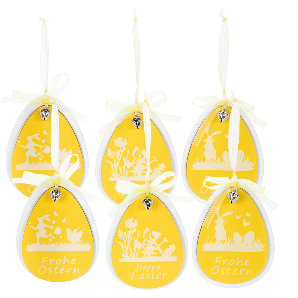 A decoração em madeira consiste na silhueta branca de um ovo de Páscoa, que se une por um cabide a um menor em amarelo. Uma paisagem de primavera está impressa em branco no pingente amarelo laqueado brilhante, no qual um elfo se ajoelha para deixar uma borboleta descansar em sua mão. O desejo "Feliz Páscoa" acompanha o nostálgico motivo pascal. Um pequeno sino de prata e uma fita translúcida amarelo-limão completam a decoração atmosférica da Páscoa da marca de qualidade VIANA.