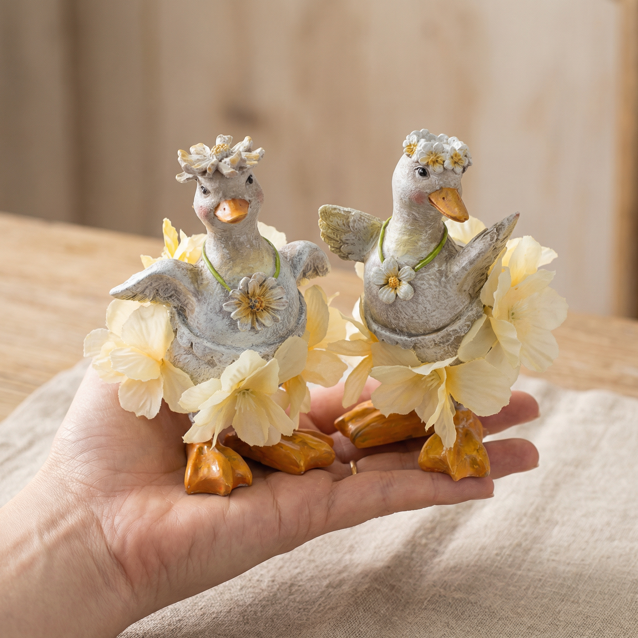 Conjunto encantador de figuras decorativas de patos com flores para a sua decoração de primavera e verão.