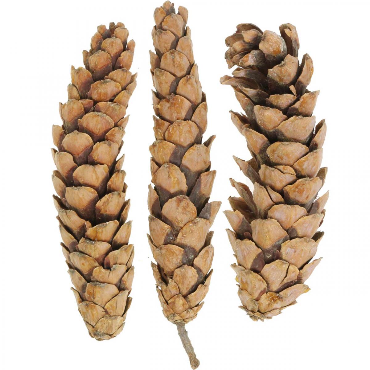 As pinhas do pinheiro Weymouth são um item natural excepcionalmente bonito! Os cones particularmente longos deste tipo de Strobus são um pouco mais estreitos em comparação com os cones de pinho usuais e são ligeiramente curvos e ligeiramente abertos. O marrom claro natural dos cones decorativos também fica muito bonito em arranjos e grinaldas.Os cones naturais têm uma longa vida útil e, portanto, são adequados para arranjos secos, como em floricultura memorial e funerária. Um arranjo com cones de Weymouth e espécies exóticas é definitivamente um ornamento de túmulo imponente e digno.