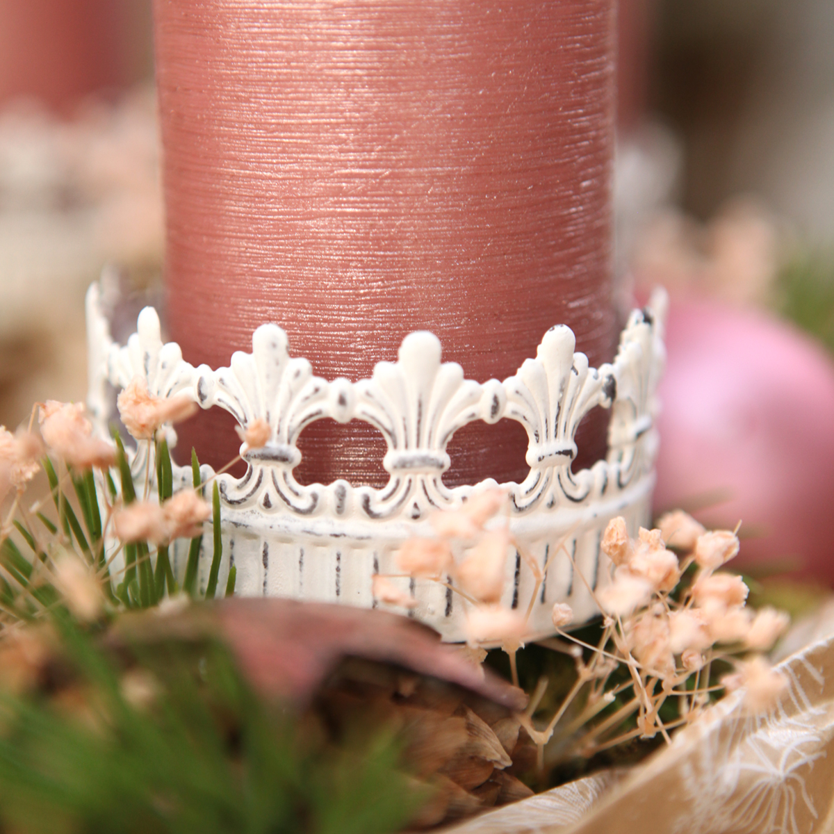 Adicione um toque de estilo vintage com este castiçal branco em um moderno estilo shabby chic! O castiçal possui uma borda adornada com ornamentos nostálgicos, e a haste cônica pode ser facilmente inserida em arranjos feitos de isopor, espuma floral, guirlandas de palha ou até mesmo terra.