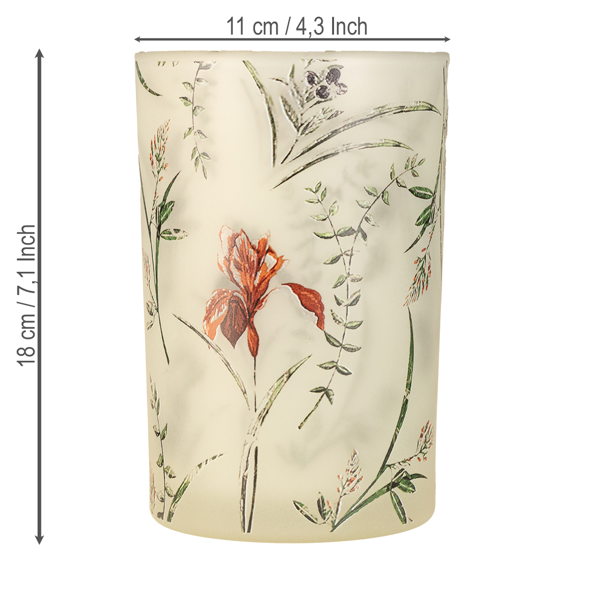 O porta-velas de vidro com seu design floral é mais do que um simples suporte para velas – é um acessório marcante para a sua casa. O delicado padrão floral em tons de bege, verde e vermelho confere um visual natural e harmonioso que complementa lindamente decorações vintage ou rústicas. O design artesanal garante que cada porta-velas seja único. Com 18 cm de altura e 12 cm de diâmetro, oferece amplo espaço tanto para velas pequenas padrão quanto para velas decorativas. O vidro de alta qualidade permite que a luz e o calor brilhem de forma encantadora – um efeito que fica particularmente mágico em ambientes com pouca luz.