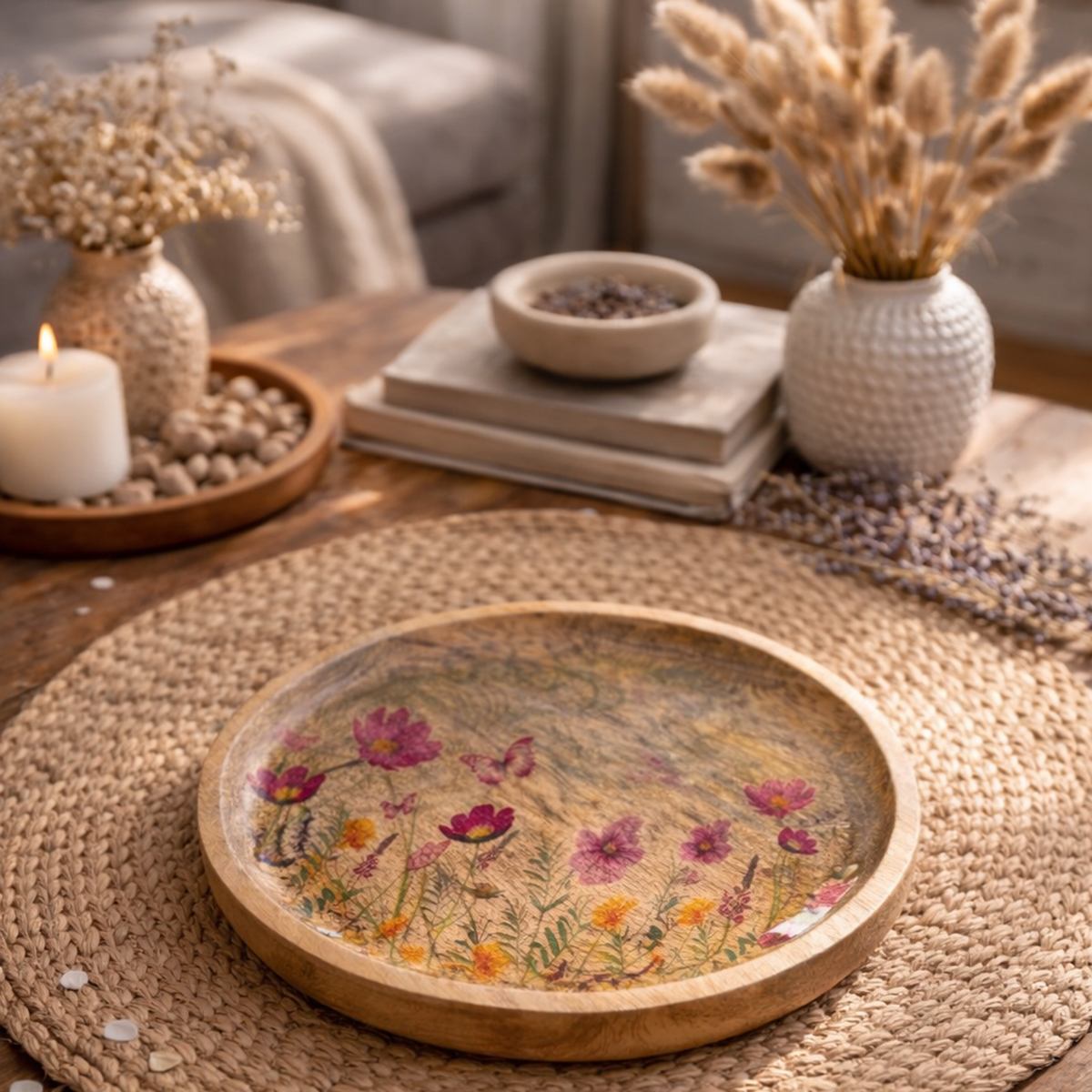 - Pratos de madeira de alta qualidade com motivos florais e borboletas
