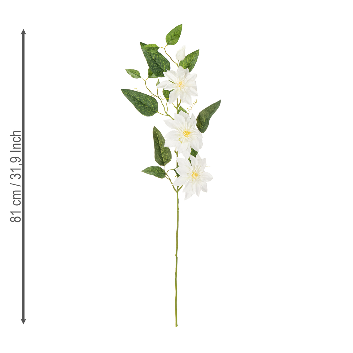Com impressionantes 81 cm de comprimento, o ramo oferece a liberdade de ser usado tanto em vasos altos quanto baixos. Um vaso de chão ou de mesa se tornará instantaneamente o ponto focal do ambiente. O ramo de clematis é particularmente adequado para ambientes claros e arejados, ou como elemento decorativo para mesas de casamento, áreas de recepção ou arranjos elegantes para escritórios. Se desejar, também pode ser combinado com outras flores decorativas transparentes ou brancas para criar um arranjo floral único. Que tal, por exemplo, adicionar um toque vintage apresentando o ramo em recipientes rústicos?