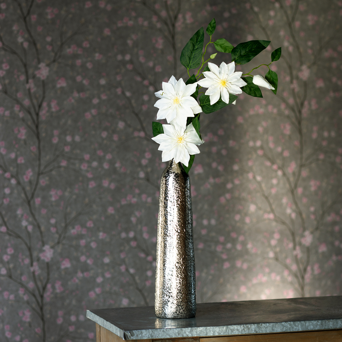 Com impressionantes 81 cm de comprimento, o ramo oferece a liberdade de ser usado tanto em vasos altos quanto baixos. Um vaso de chão ou de mesa se tornará instantaneamente o ponto focal do ambiente. O ramo de clematis é particularmente adequado para ambientes claros e arejados, ou como elemento decorativo para mesas de casamento, áreas de recepção ou arranjos elegantes para escritórios. Se desejar, também pode ser combinado com outras flores decorativas transparentes ou brancas para criar um arranjo floral único. Que tal, por exemplo, adicionar um toque vintage apresentando o ramo em recipientes rústicos?