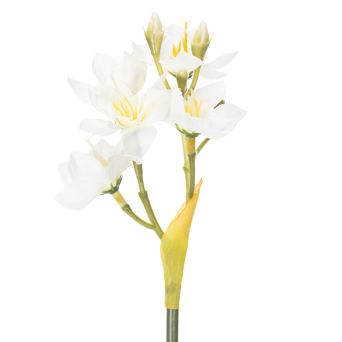 - Narcisos artificiais realistas em um branco brilhante com detalhes em amarelo.
