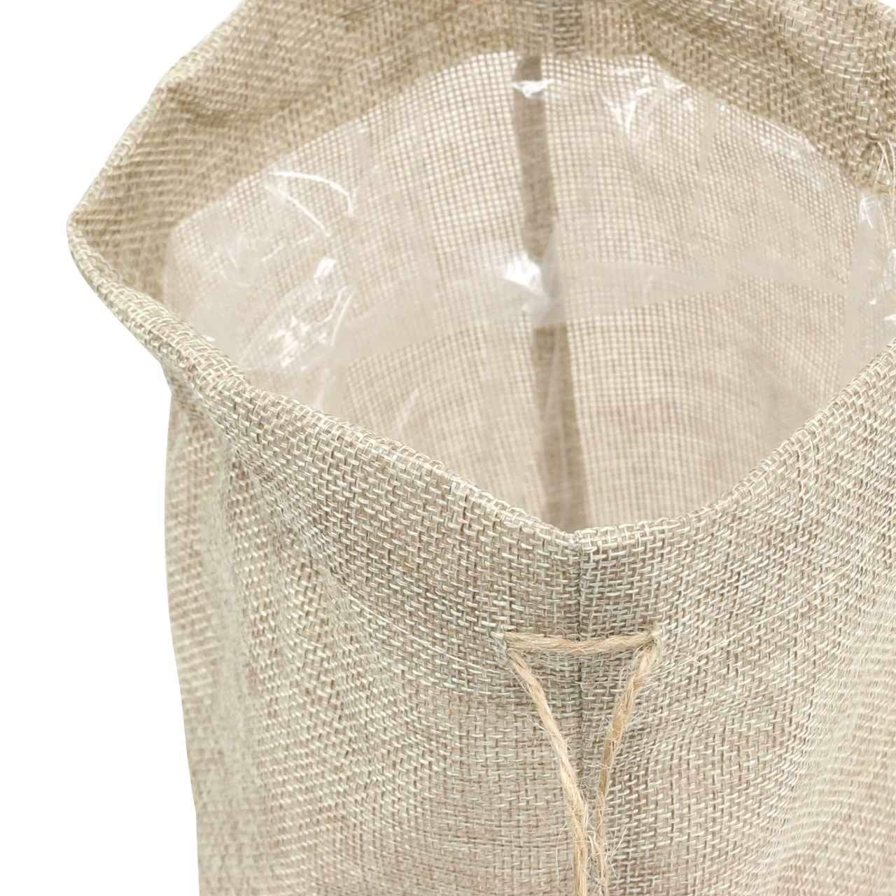 A bolsa de juta é finamente tecida, colocada sobre uma camada resistente ao rasgo de plástico muito fino e fornecida com um cordão em cores naturais. O interior do saco também é forrado com filme plástico resistente, de modo que também é adequado para presentes de flores ou até mesmo como plantador.