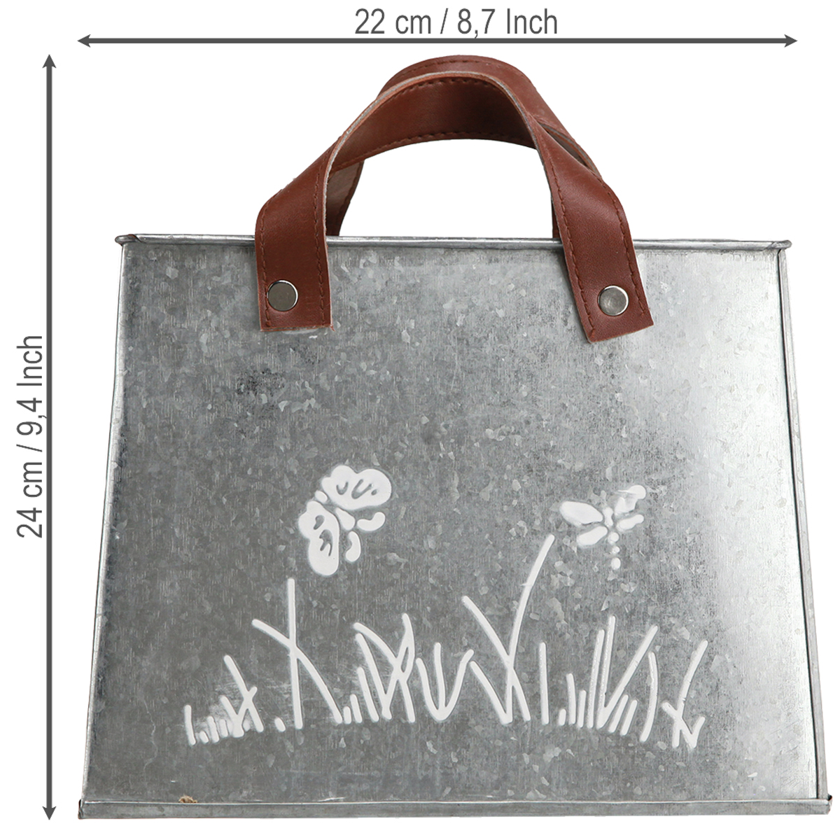 As nossas bolsas decorativas em metal prateado combinam funcionalidade e design de uma forma extraordinária. Estas floreiras são ideais para decoradores, mentes criativas e qualquer pessoa que queira adicionar um toque de elegância à sua casa. Com um motivo branco de borboletas e gramíneas em ambos os lados e as alças em couro sintético marrom, você obtém um produto que serve tanto como vaso de planta quanto como elemento decorativo para varanda ou mesa. Esta bolsa decorativa para plantas destaca o charme rústico e combina lindamente com outras decorações vintage. Dê um toque pessoal à sua casa com estes extraordinários vasos de metal, que impressionam pela sua elegância simples e intemporal.
