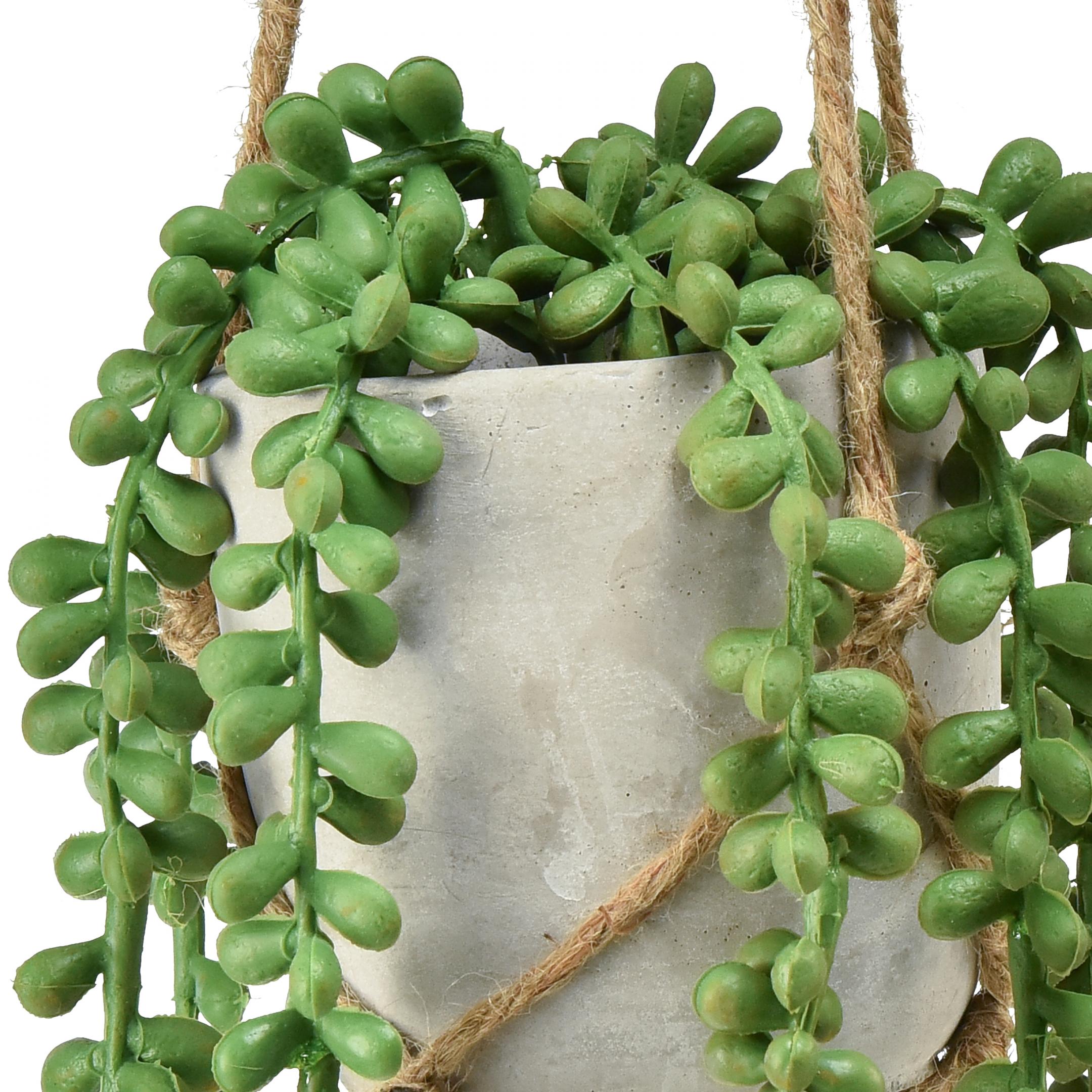 Se você costuma fazer viagens longas ou deseja pendurar cestos suspensos em vigas de madeira do telhado de difícil acesso para regar, a suculenta suspensa na versão artificial é uma ponta decorativa verde.
