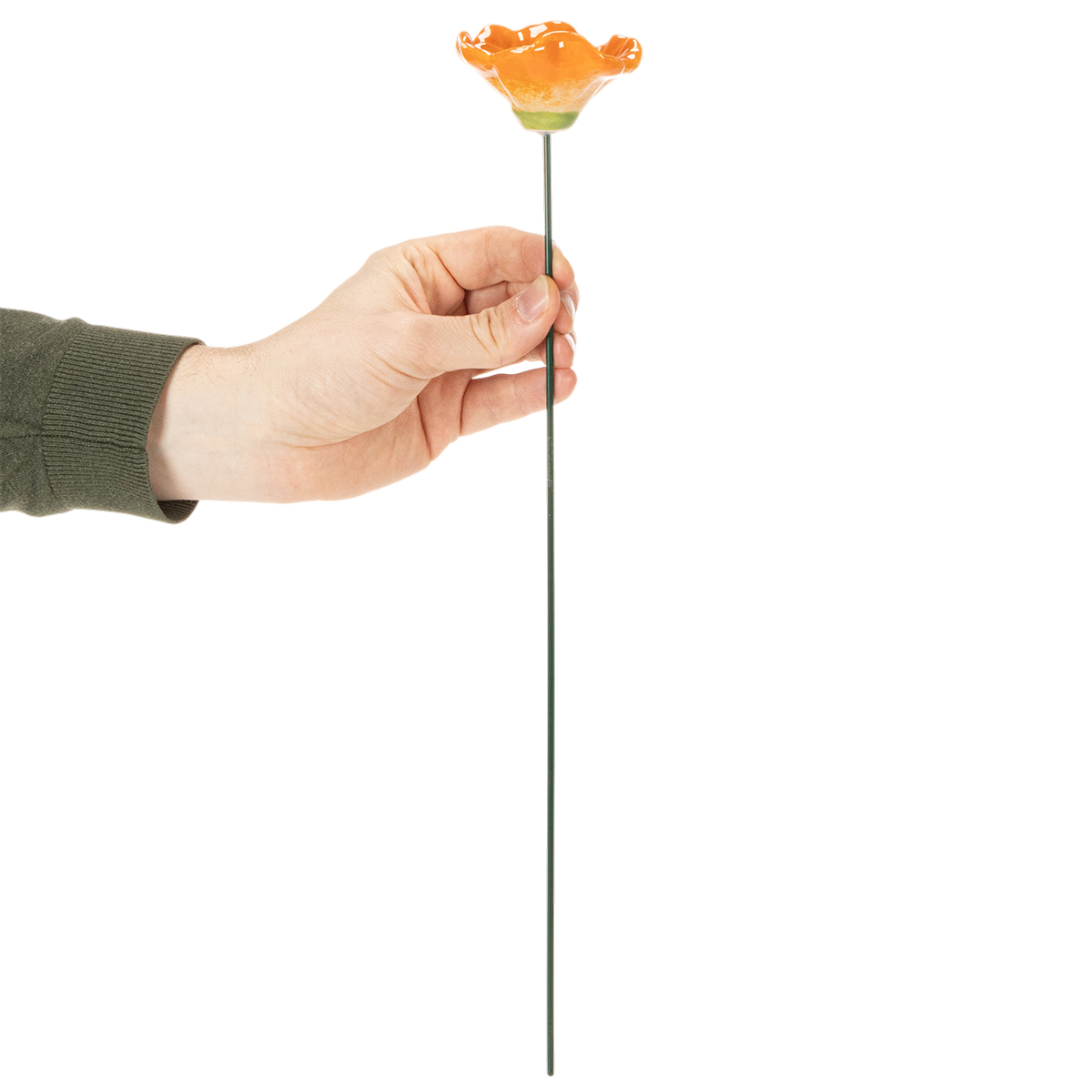 Nossas estacas de jardim em formato de papoula combinam um design atraente com qualidade superior. Feitas de cerâmica com acabamento meticuloso, impressionam pela sua textura refinada e detalhes intrincados. Os tons quentes de laranja e branco das pétalas criam um efeito vibrante, iluminando qualquer jardim. Graças ao seu aspecto artesanal, as estacas exalam uma naturalidade artística que se encaixa perfeitamente em um arranjo de jardim de inspiração mediterrânea ou campestre. Combine essas flores com plantas verdes ou vasos de flores neutros – elas se integram harmoniosamente, sem deixar de ser um destaque.