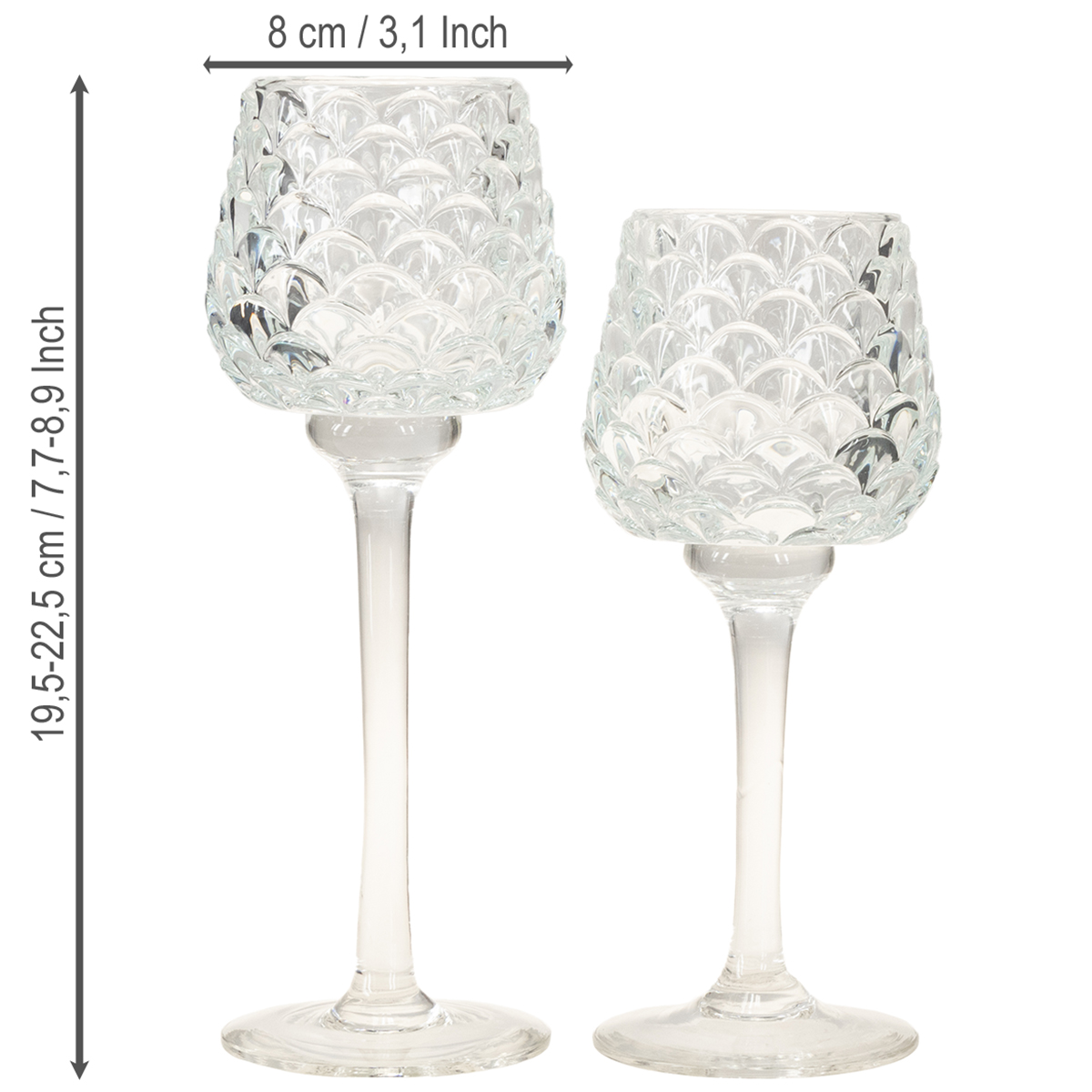 O conjunto "Suporte para Velas Tealight em Cone de Vidro com Base" é composto por dois suportes de alturas diferentes, com aproximadamente 19,5 cm e 22,5 cm de altura. O vidro transparente de alta qualidade impressiona com sua estrutura em formato de cone e combina discretamente com qualquer ambiente sem perder o brilho. As bases conferem elegância aos suportes e garantem estabilidade — um detalhe inteligente que é tão prático quanto elegante.