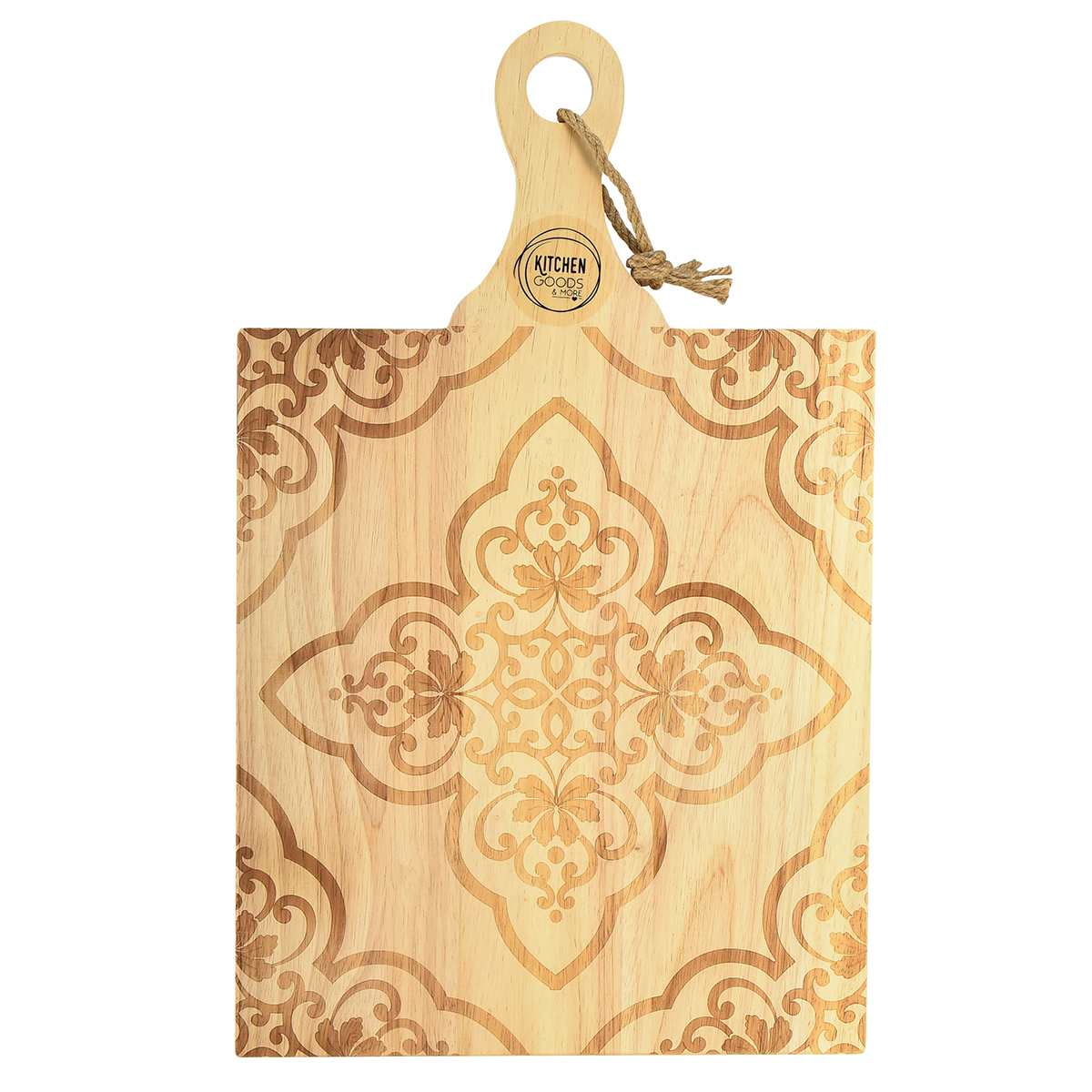 O motivo floral, muito clássico, é discretamente gravado na madeira clara e fica atraente em marrom claro. A tábua de madeira pode ser pendurada na alça como decoração de parede. A tábua de corte é adequada para decorações e alimentos frios, pois a madeira natural da mangueira não foi tratada.