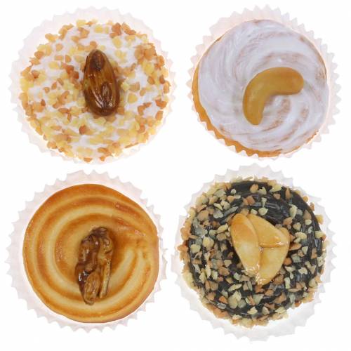 Você obtém as tortinhas artificiais 4 vezes em caixas de papel reais como um conjunto de 4 peças com nozes diferentes. Cada massa artificial tem um diâmetro aproximado de 5 centímetros.