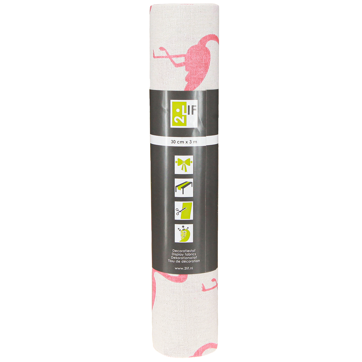 O tecido decorativo branco com a impressão de flamingo rosa tem um comprimento total de cerca de 3 metros e uma largura de cerca de 30 centímetros.