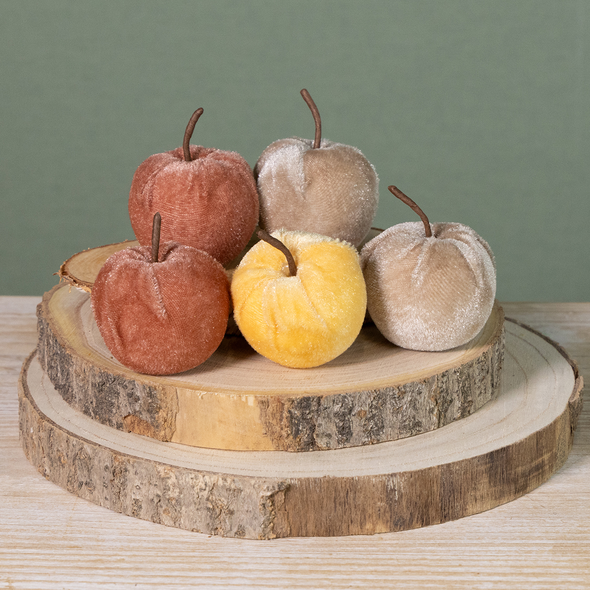 Maçãs de tecido decorativas: elegância aveludada em marrom e amarelo para decoração criativa de mesa no outono