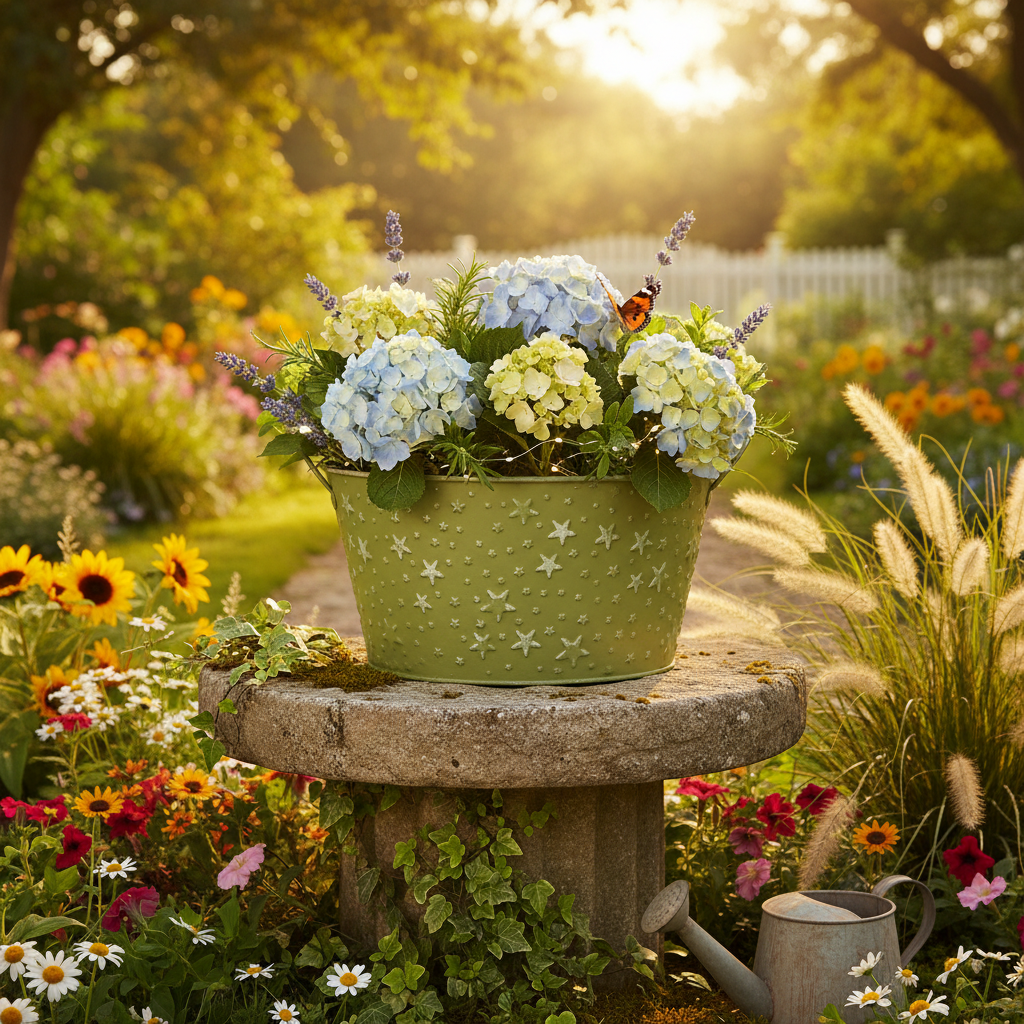 - Uso multifuncional como tigela ou plantador de metal decorativo
