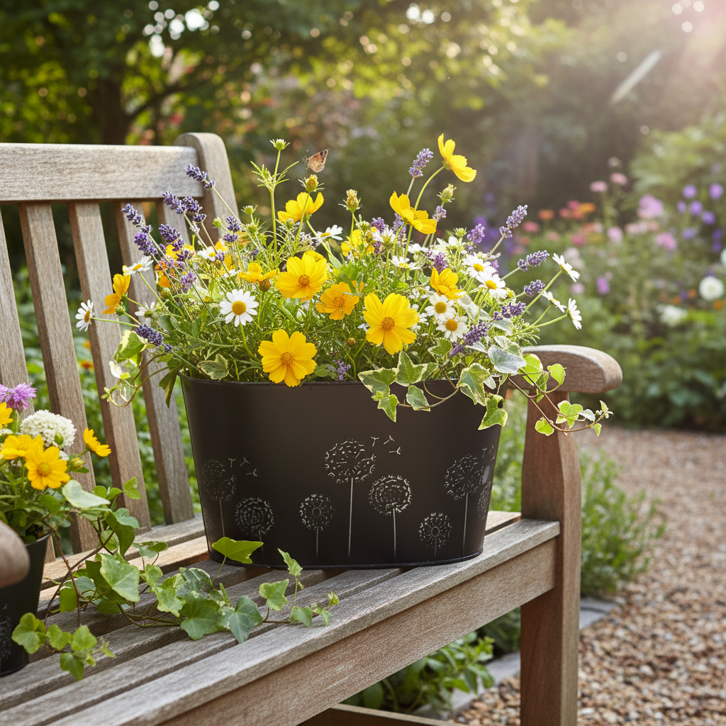A combinação contrastante de preto fosco e prata torna a bandeja para plantas particularmente chique. Alguns dos parapentes prateados com motivos detalhados estão apenas sendo pegos pelo vento para seguir em sua jornada.