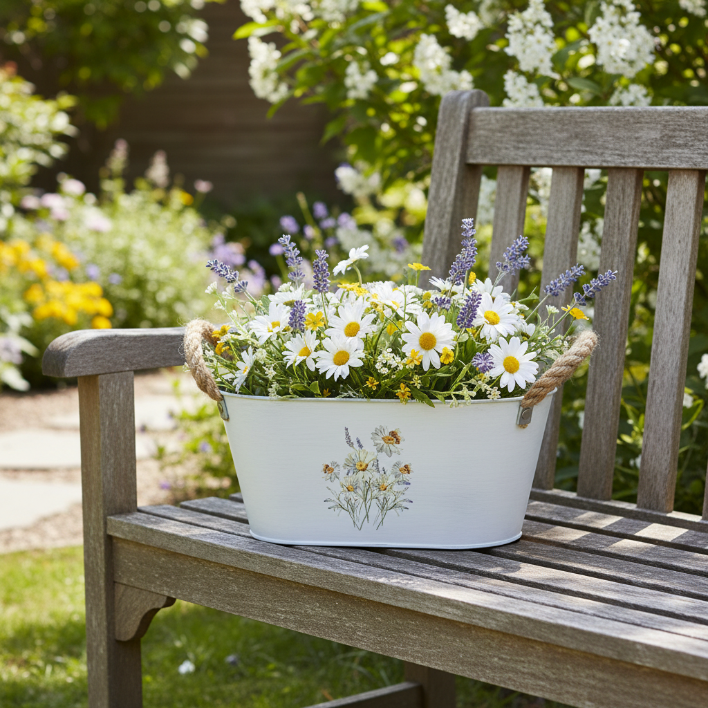 Margaridas brancas e lavanda roxa florescem na tigela decorativa de metal oval. As abelhas visitam as flores. Duas alças de juta completam artisticamente a imagem natural da tigela de metal branco.