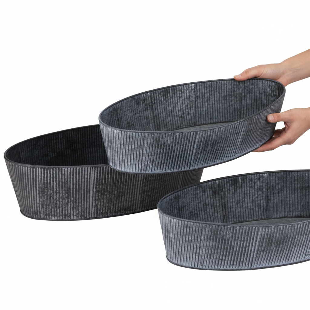 A tigela oval feita de metal e preto combina elegância e estilo com uma estética vintage charmosa que valorizará sua casa. Seja como uma tigela decorativa atraente, como uma decoração de mesa nostálgica ou como uma tigela de flores rústica - este conjunto de duas tigelas de metal empilháveis abre inúmeras possibilidades criativas. O elegante esquema de cores em preto, cinza lavado, assim como o design com ranhuras finas harmonizam perfeitamente com qualquer interior em estilo shabby chic ou industrial. Use as tigelas como recipientes para plantas e adicione um toque de verde com plantas domésticas ou ervas. O menor é perfeito para guardar chaves com estilo ou para suculentas.